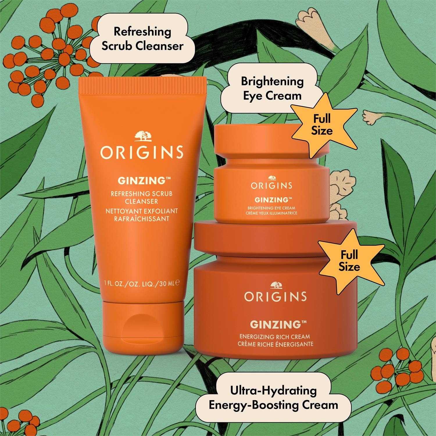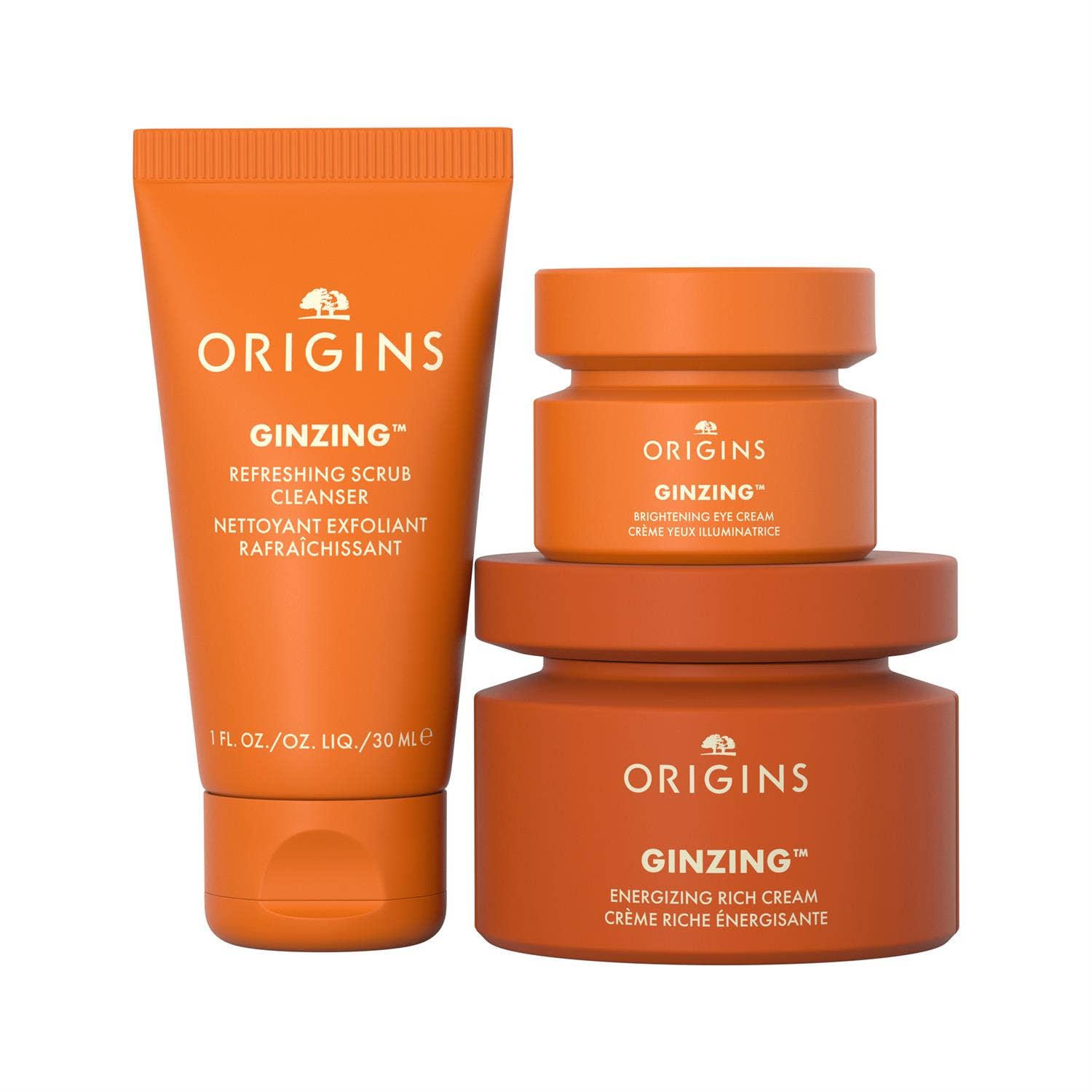 Gjafasett frá Origins sem inniheldur: GinZing™ Ultra-Hydrating Energy-Boosting Cream 50ml GinZing™ Brightening Eye Cream 15ml GinZing™ Refreshing Scrub Cleanser 30ml
