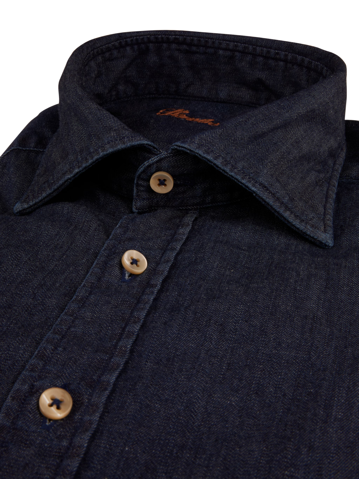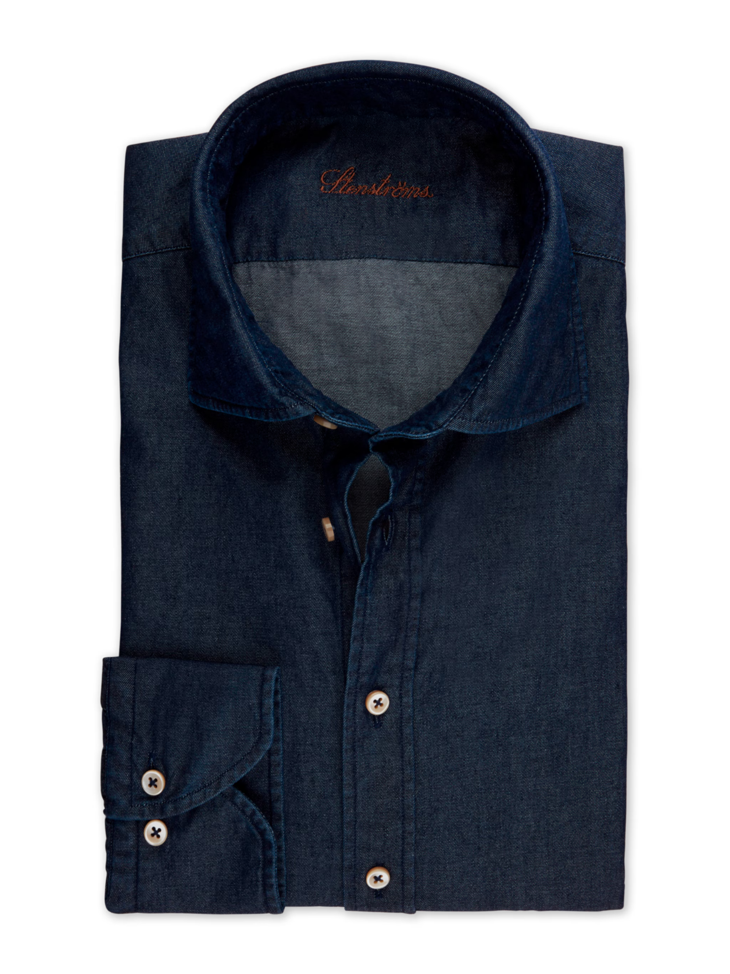 This denim shirt is made of cotton and elastane and is detailed with mother of pearl buttons, single cuffs and a cut away collar. Semi cut away collar, No. 92 Single Cuff Denim Mother of Pearl ... Sjá nánar