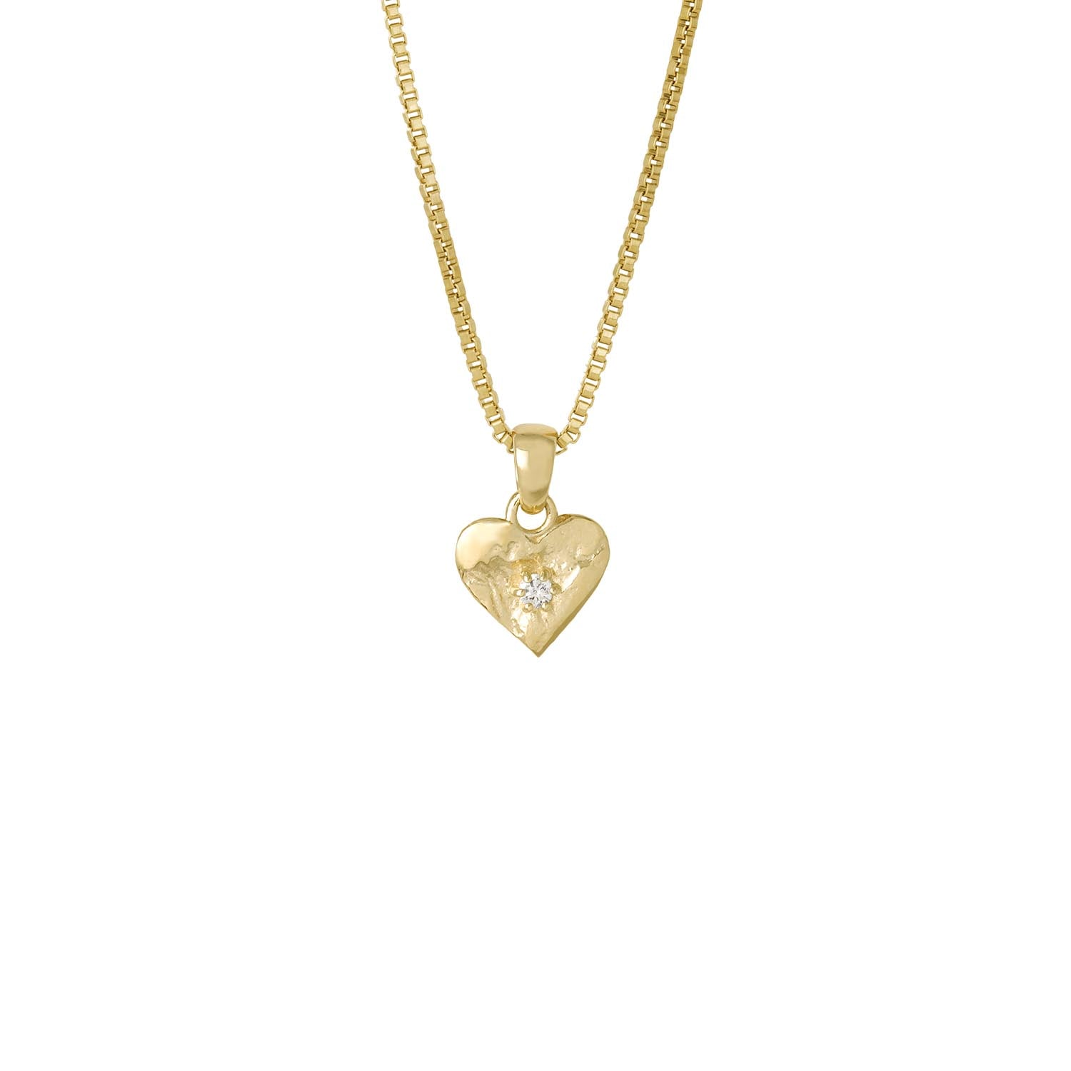 Hjartað er handsmíðað úr 14 karta gulli með 3 punkta demanti í TW VS1 gæðum.  Hæð hjartans er um 9 mm. Hönnuður og smiður er Berglind Snorra.