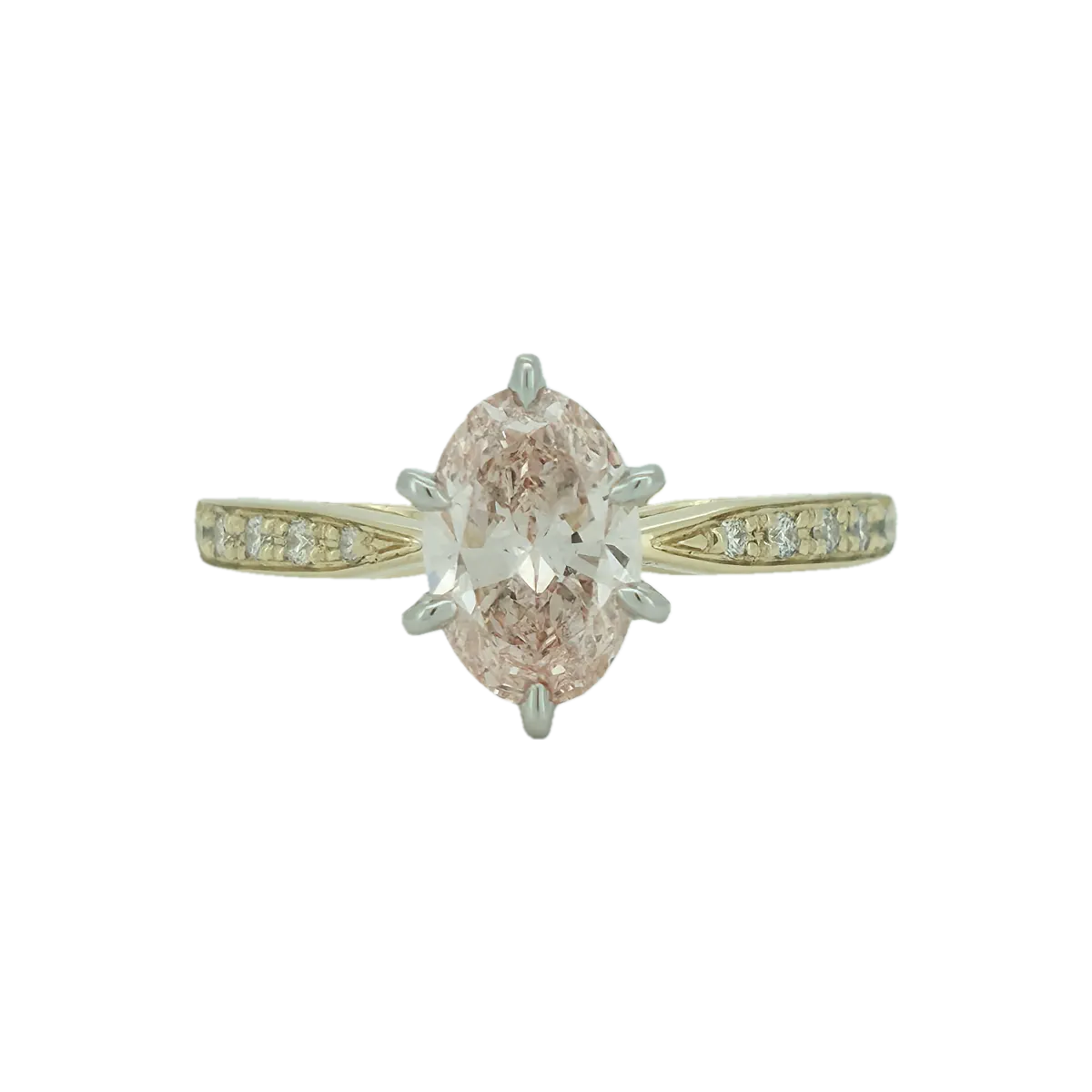 Efni hrings: 14kt gull Steinar: 12 demantar - 0,12ct - Top Wesselton VS | 1 ræktaður demantur - 1.01ct VVS - bleikur og oval-laga