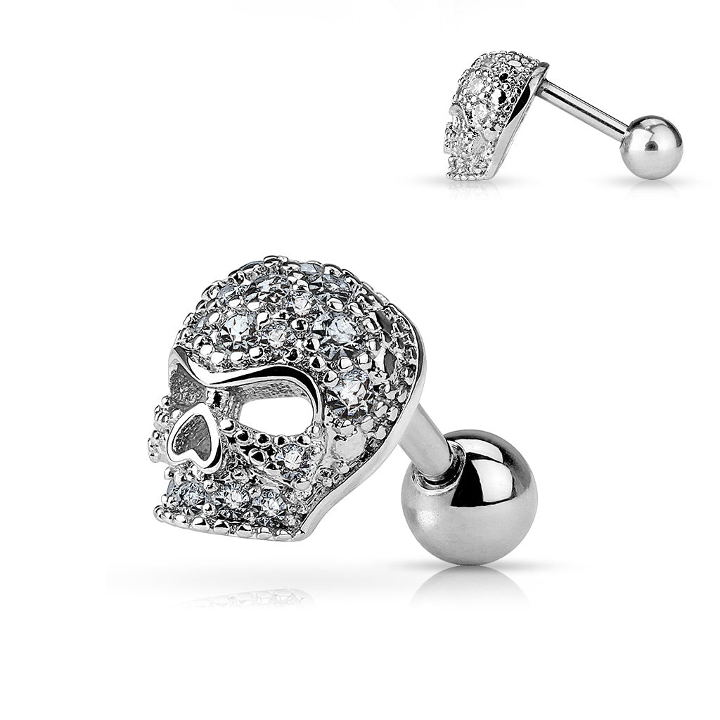 Hauskúpa með steinum. Gerður úr 316L Surgical Steel .   Lokkurinn er 8mm að lengd og 1.2mm þykkur með kúlu festingu .  Passar í t.d. Helix, Tragus, Conch, forward helix, medusa, labret, ... Sjá nánar