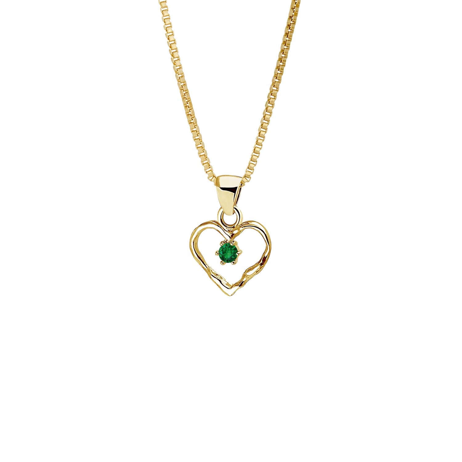 Hjartað er handsmíðað úr 14 karata gulli með emerald steini. Menið er um 11 mm á hæð.  Hönnuður og smiður er Berglind Snorra.