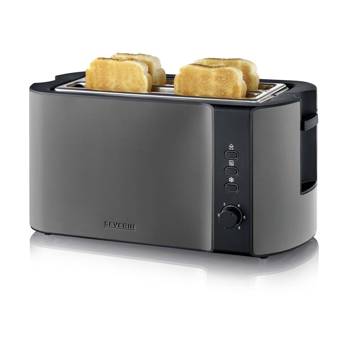 Steingrá 1400W brauðrist frá Severin sem ristar 4 brauðst. 6 ristunarstillingar auk afþíðingar og upphitunar. Fjarlægjanlegur mylsnubakki.