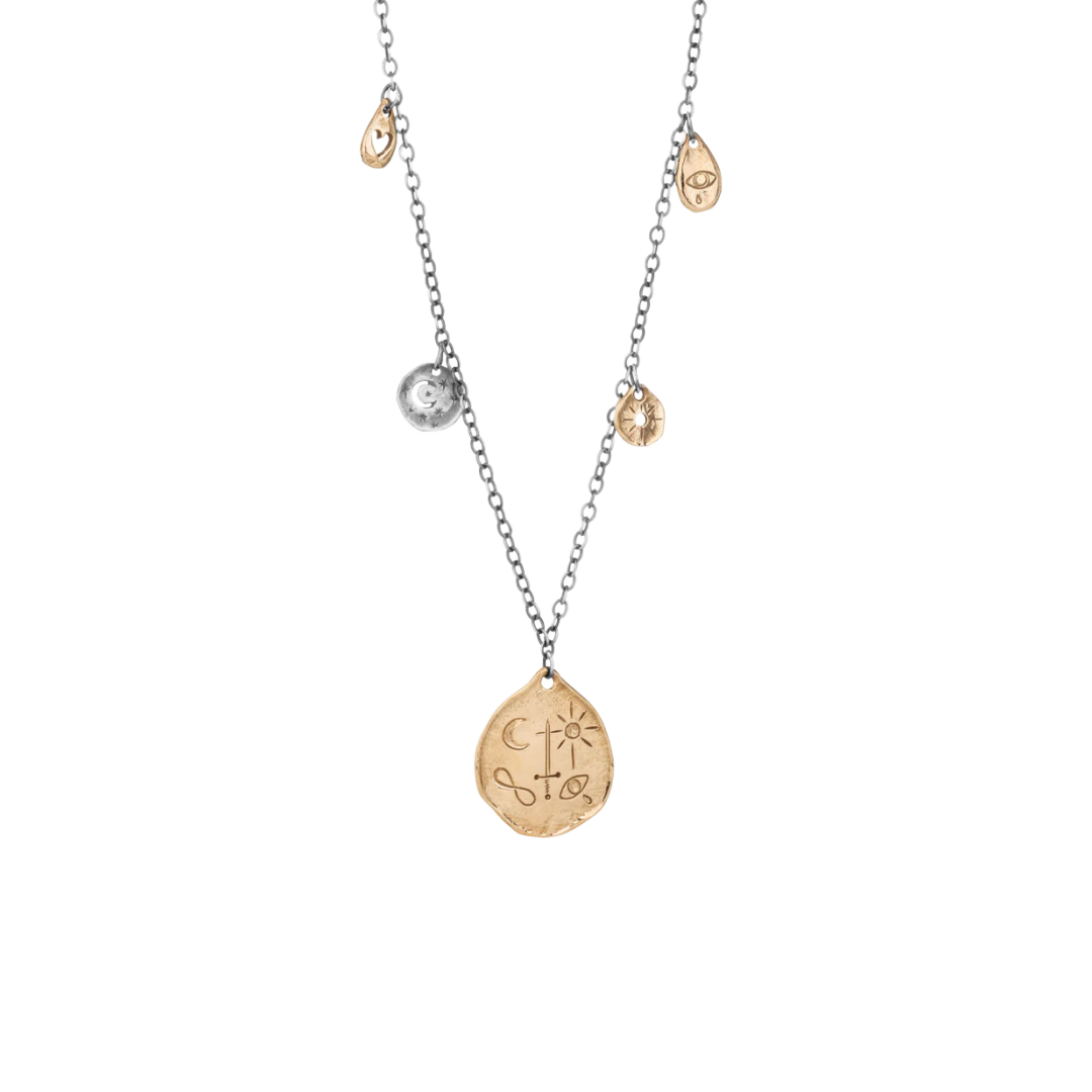 Four smaller bronze and silver coins / tears with each a different symbol attached to the chain.The symbols engraved on the big bronze coin: The Moon, the Sword, the Sun, the Eternity symbol ... Sjá nánar