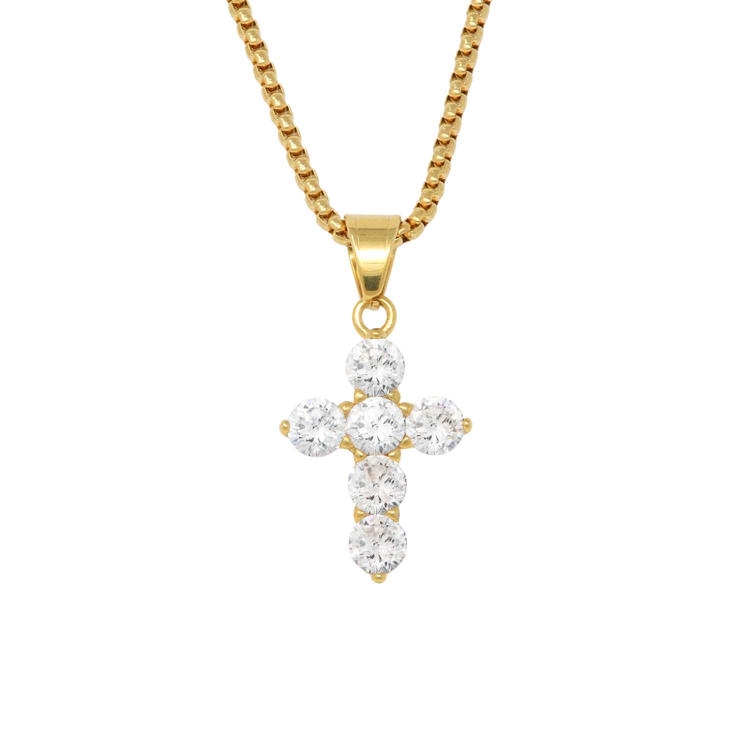 Krossinn er úr gullhúðuðu stáli með cubic zirconia steinum. Hæð krossins er um 30 mm.  Festin er 60 cm á lengd.