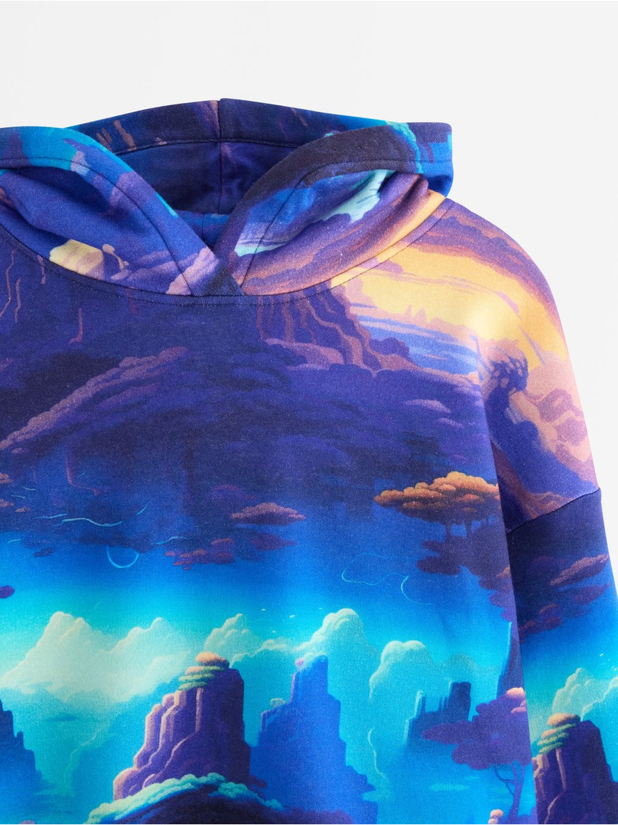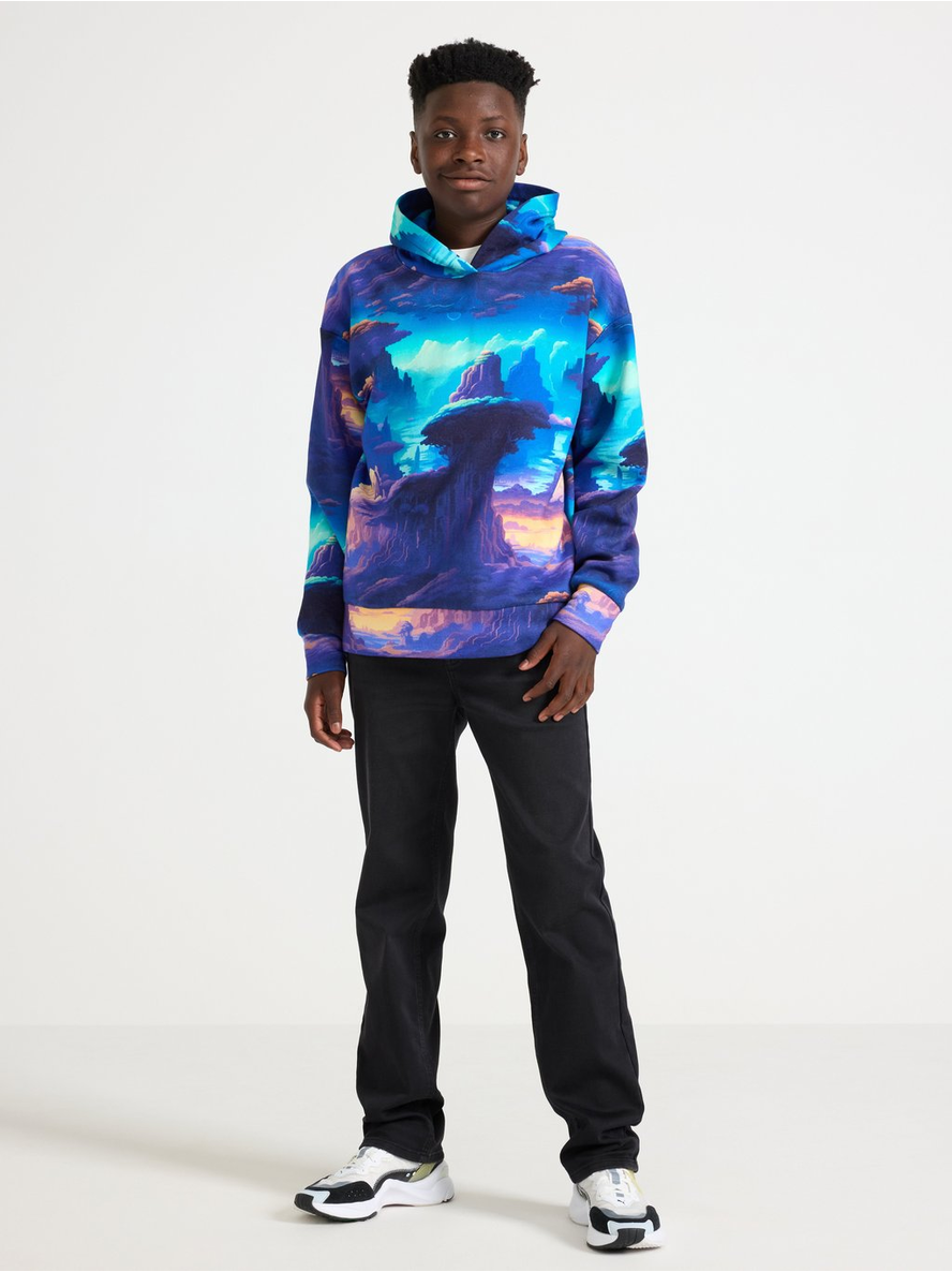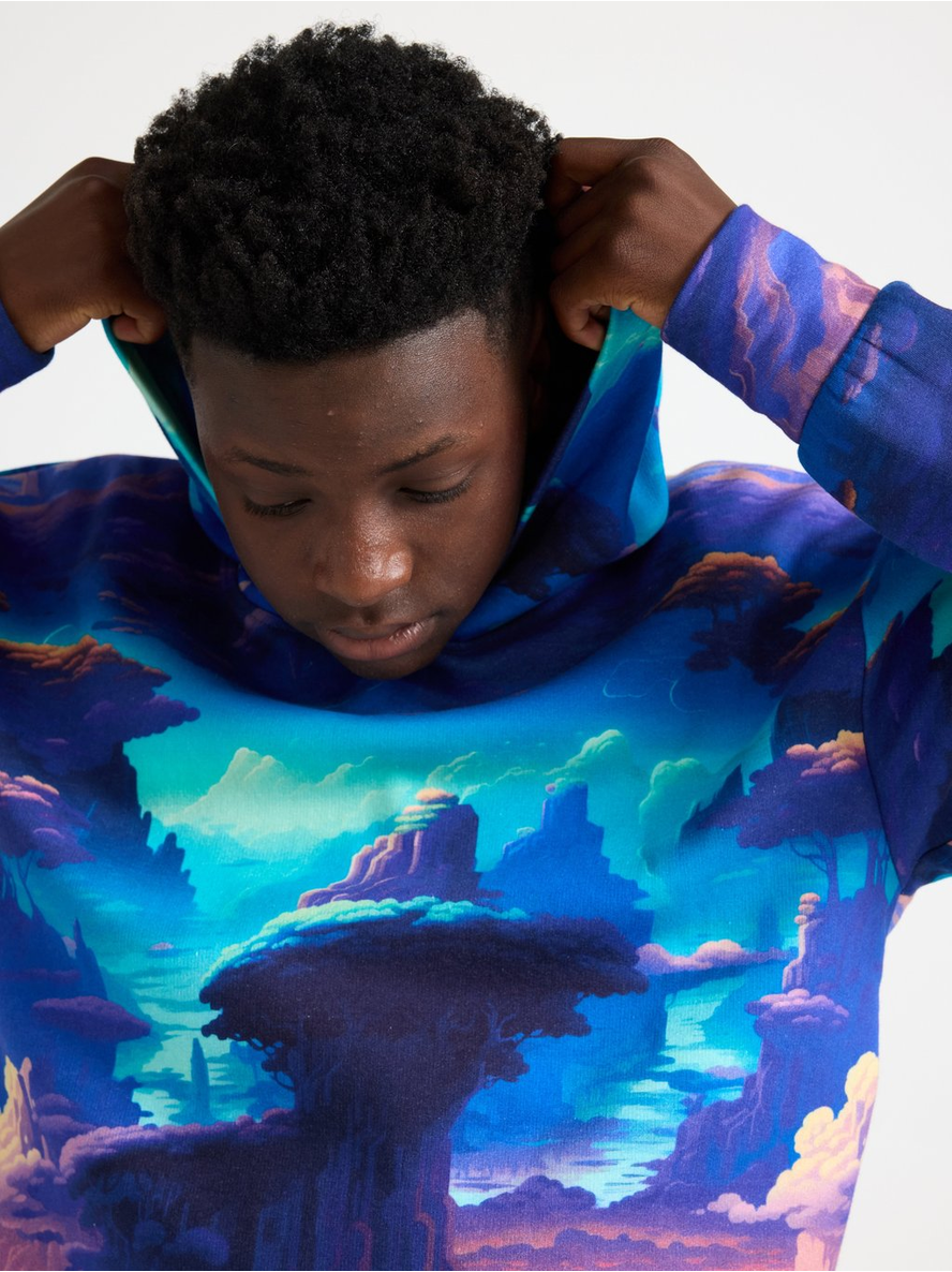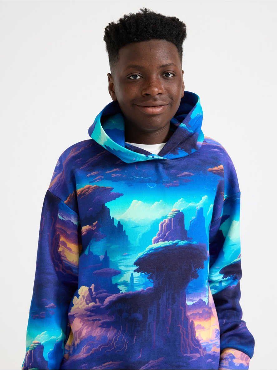 Comfortable hoodie in cotton blend with soft brushed inside and allover pattern. Relaxed fit Contains 50% organic cotton Contains 28% recycled cotton 78% bómull 22% pólýester
