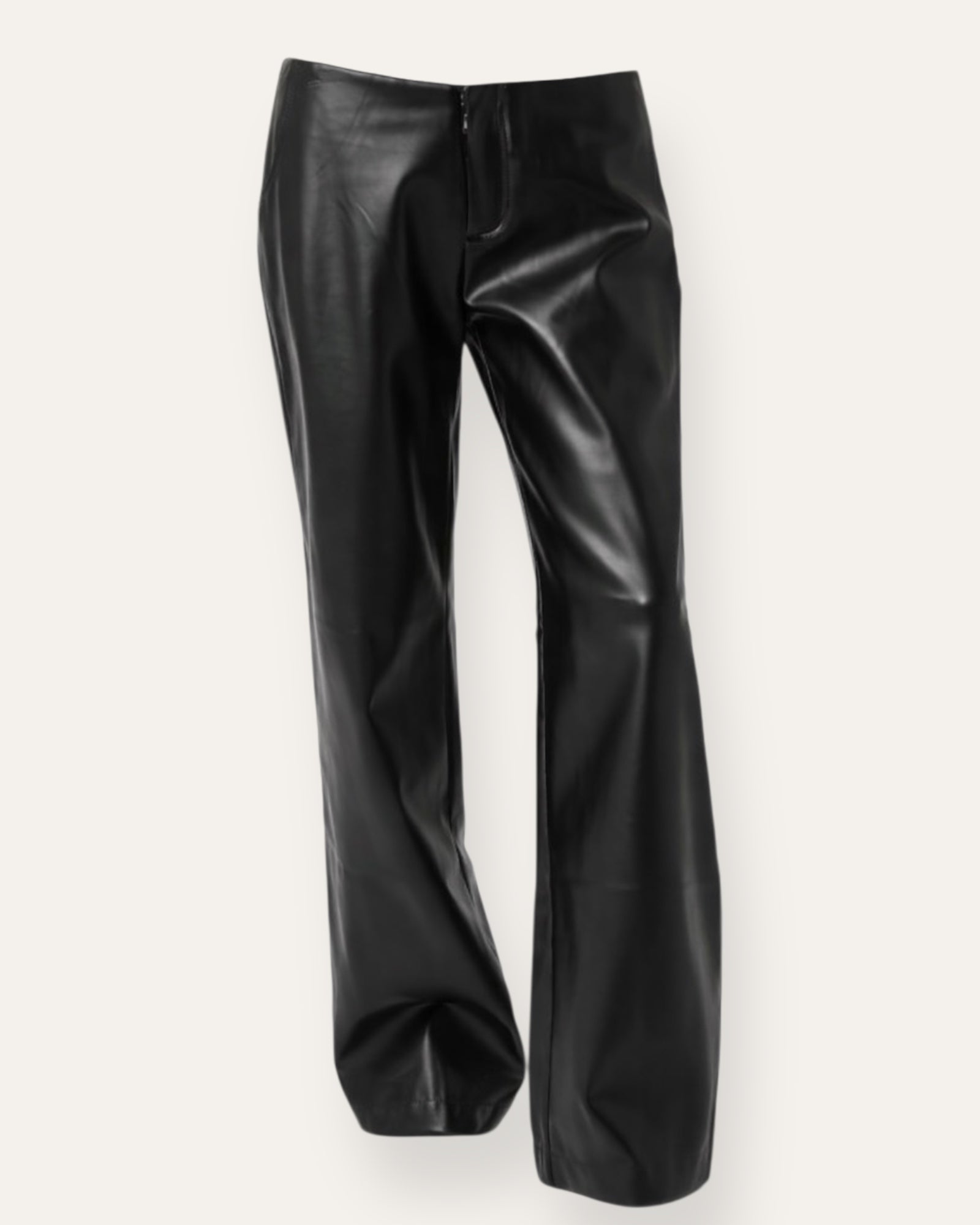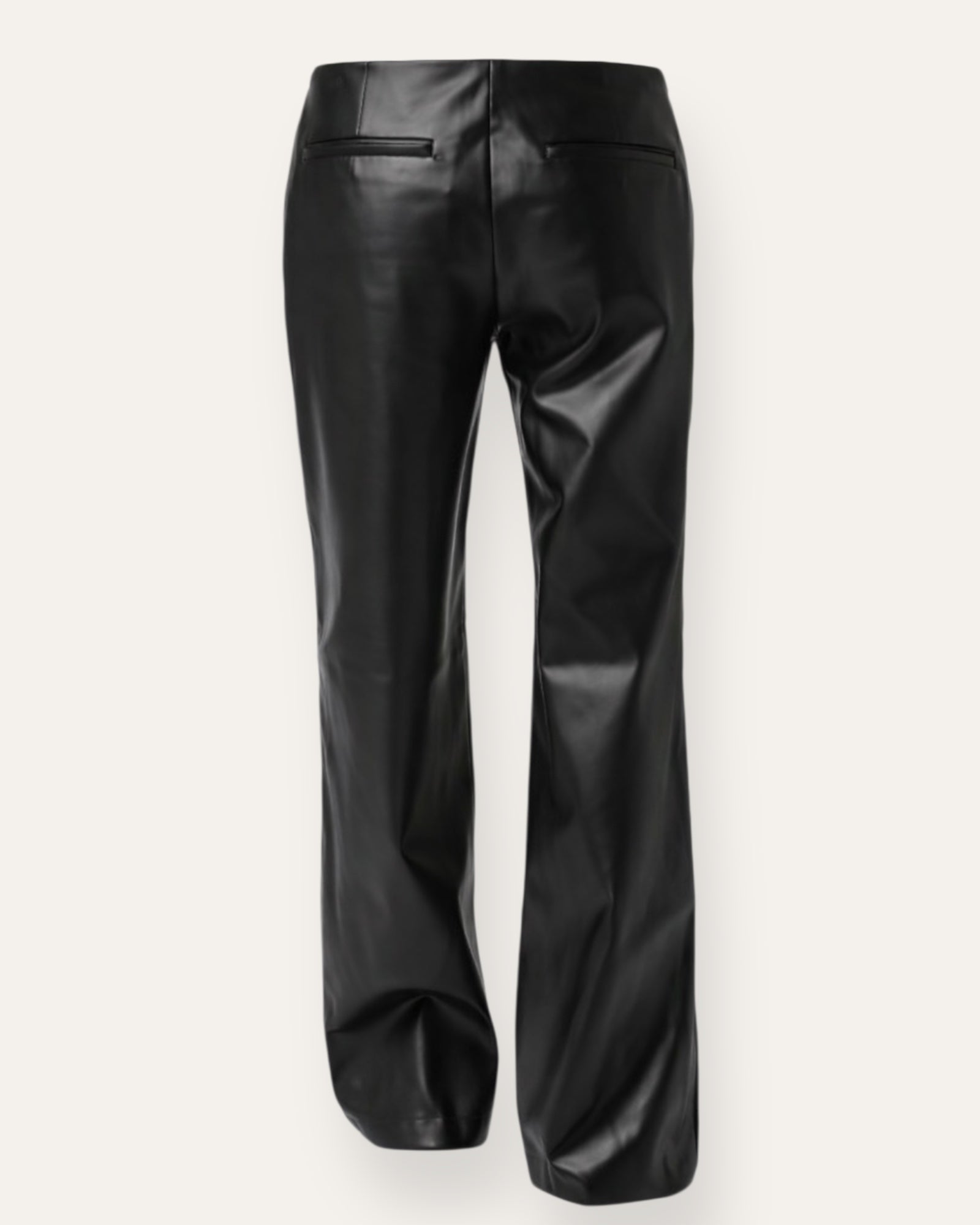 Svartar low waist leðurbuxur úr mjúku og teygjanlegu gervileðri. Þær eru lágar í mitti með beinu sniði og léttu flare niður, sem gefur flott og töff útlit. Slétt áferð með fallegum gljáa sem ... Sjá nánar