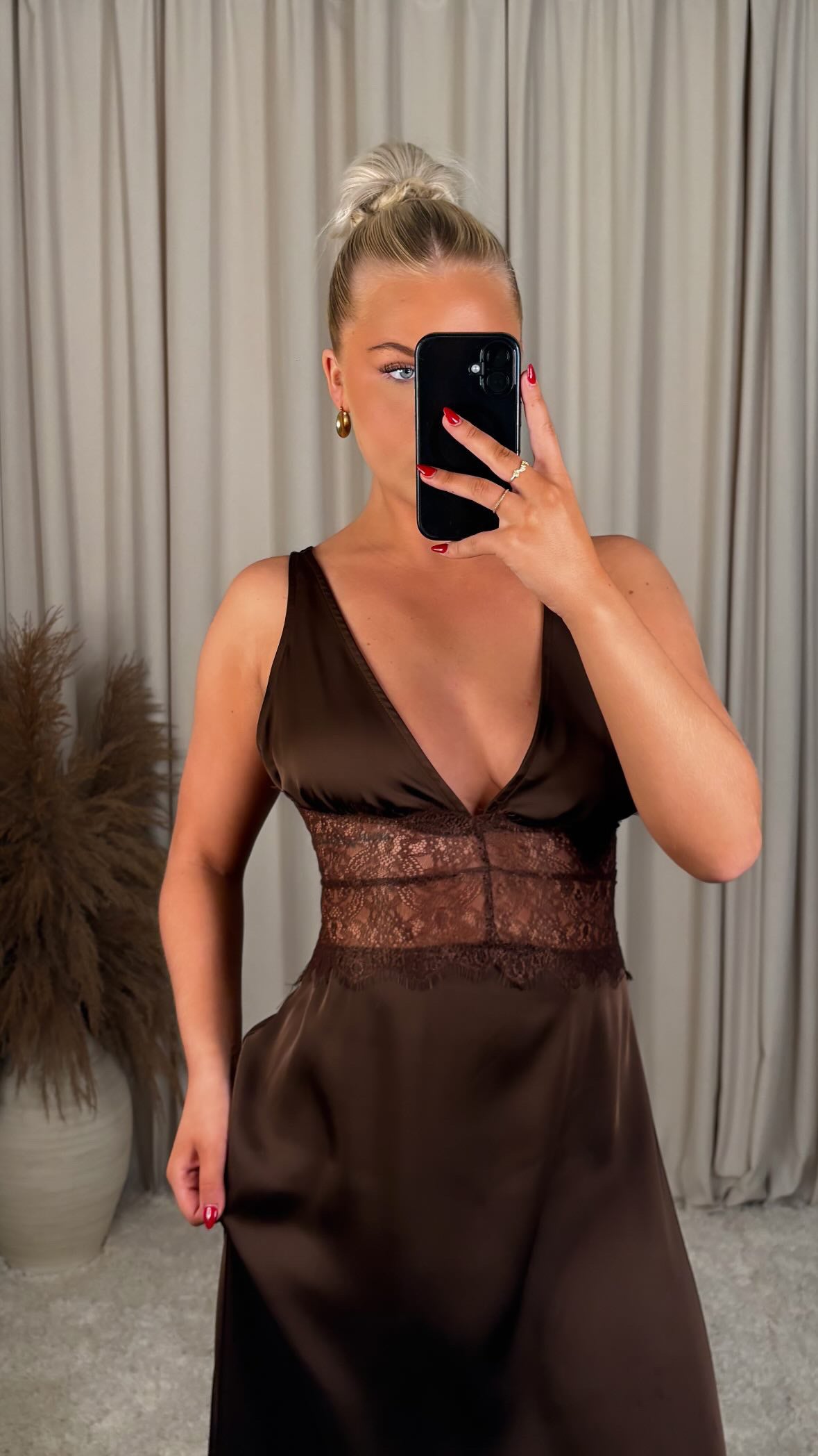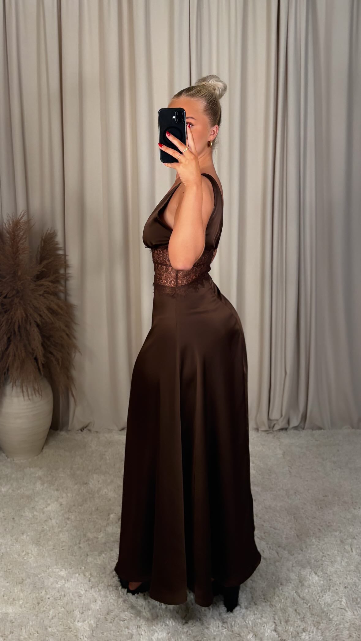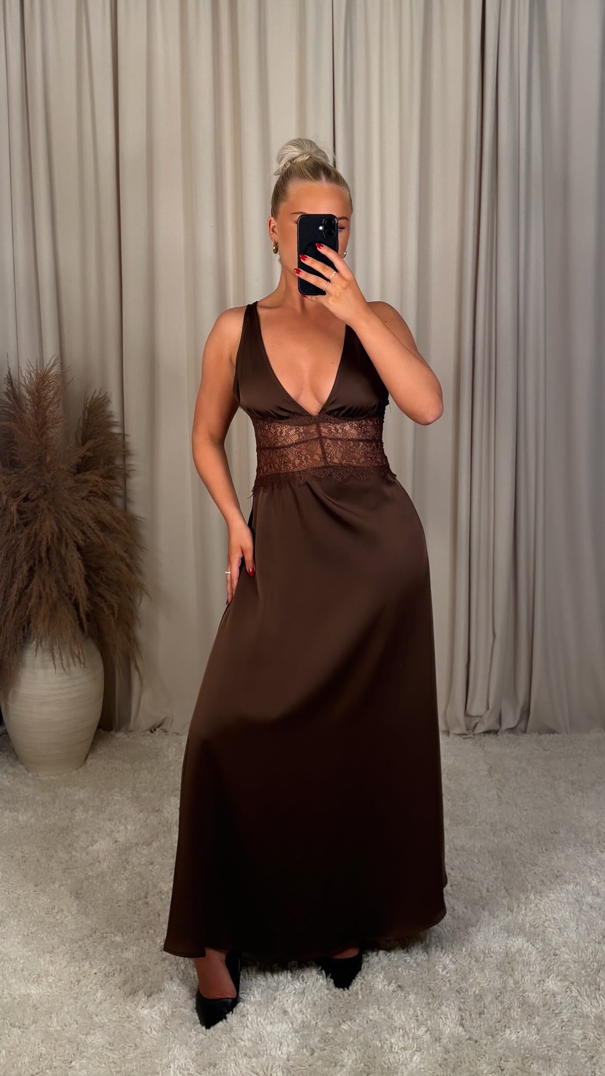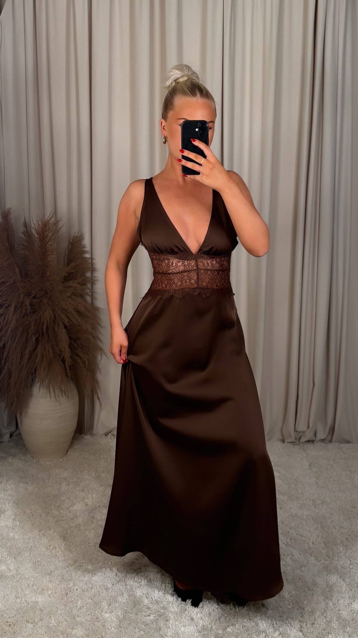 Æðislega fallegur satín kjóll með blúndu, það er engin teygja í efninu og er með rennilás að aftan  modelið er 168cm og er í stærð S