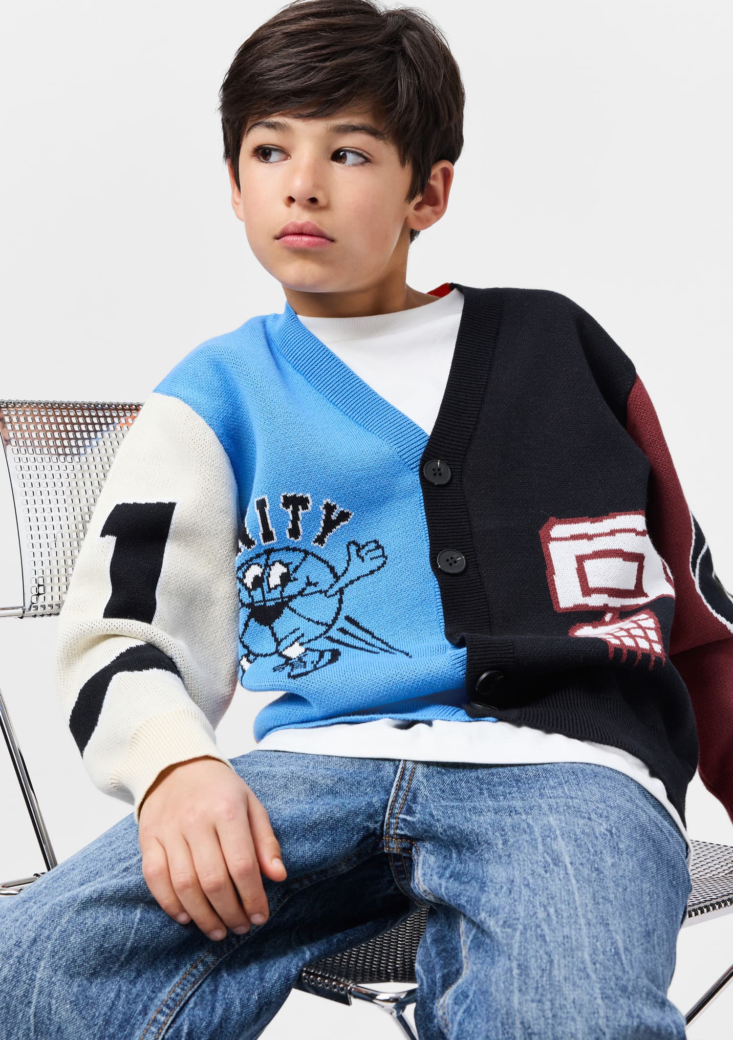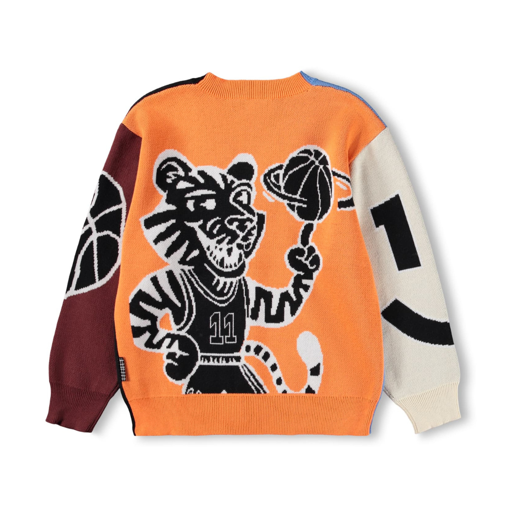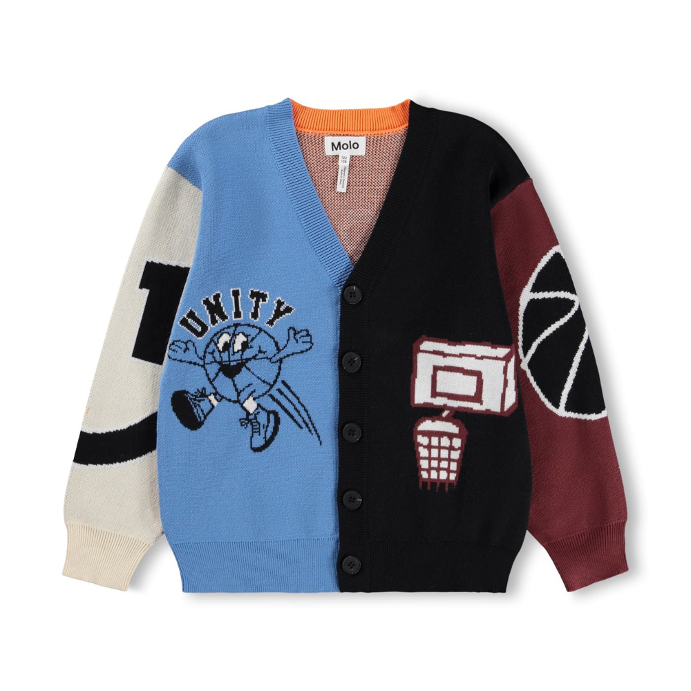 Marglit prjónapeysa með myndum frá Molo. Peysan er hneppt 80% bómull og 20% ull.