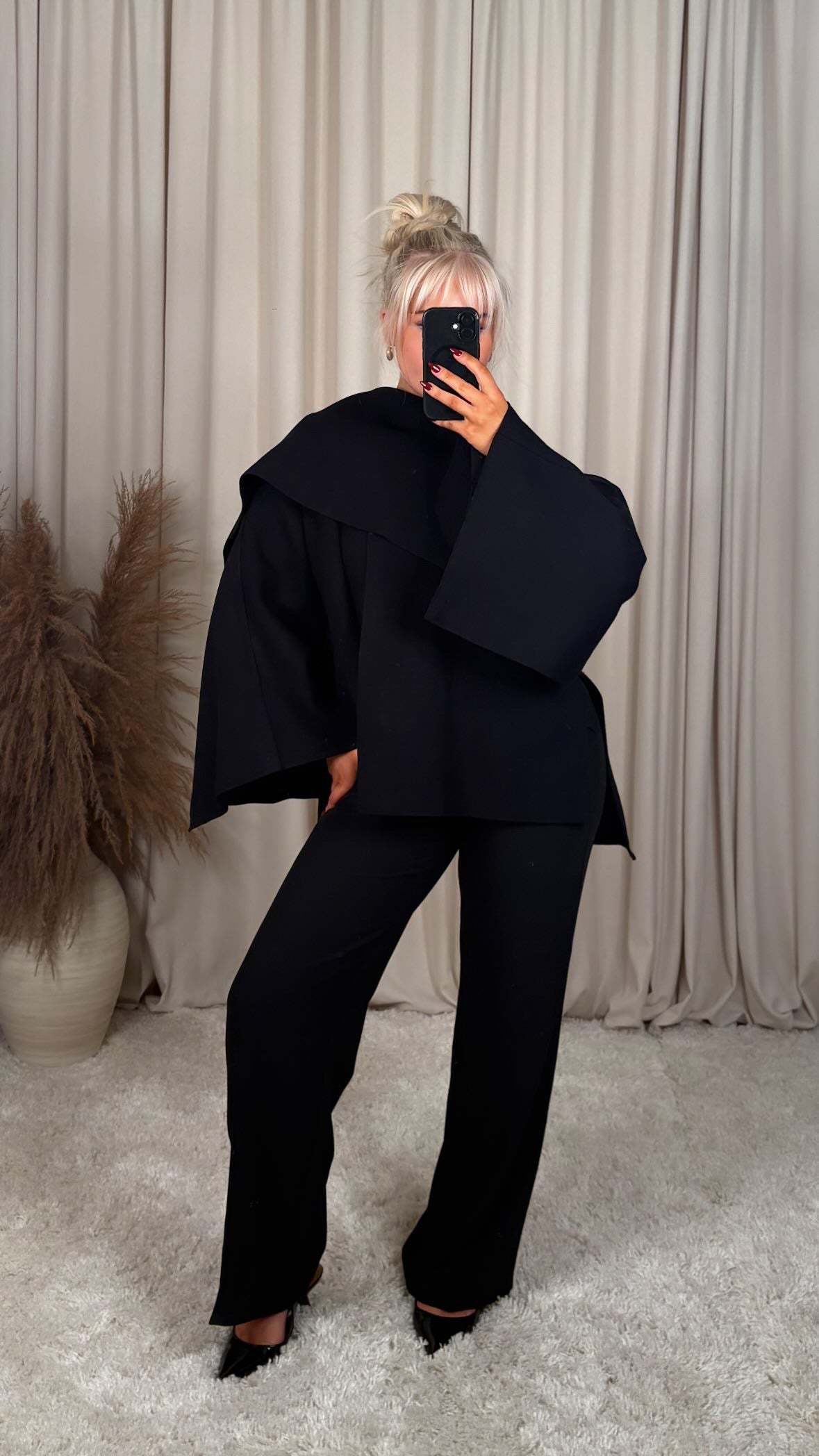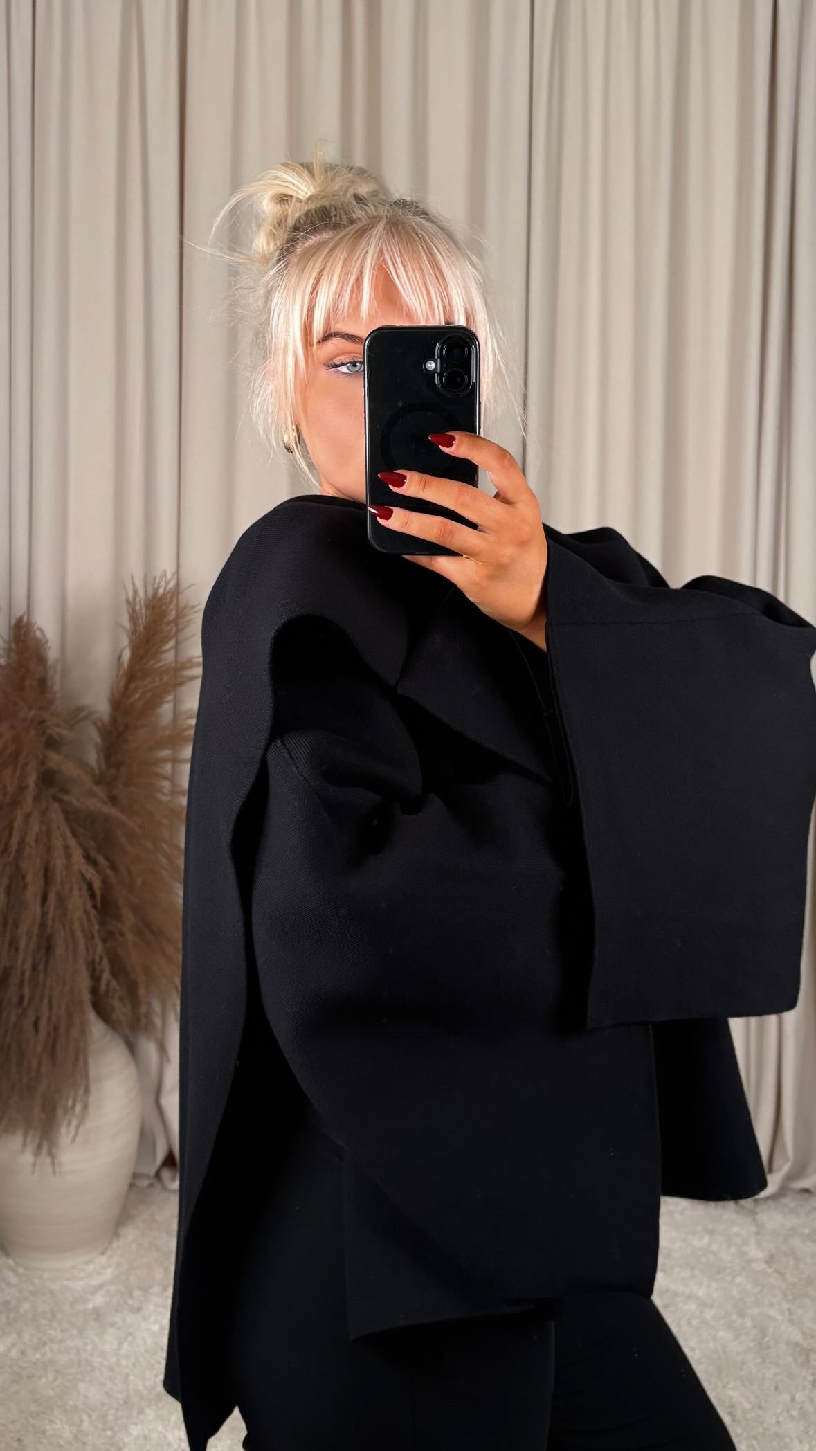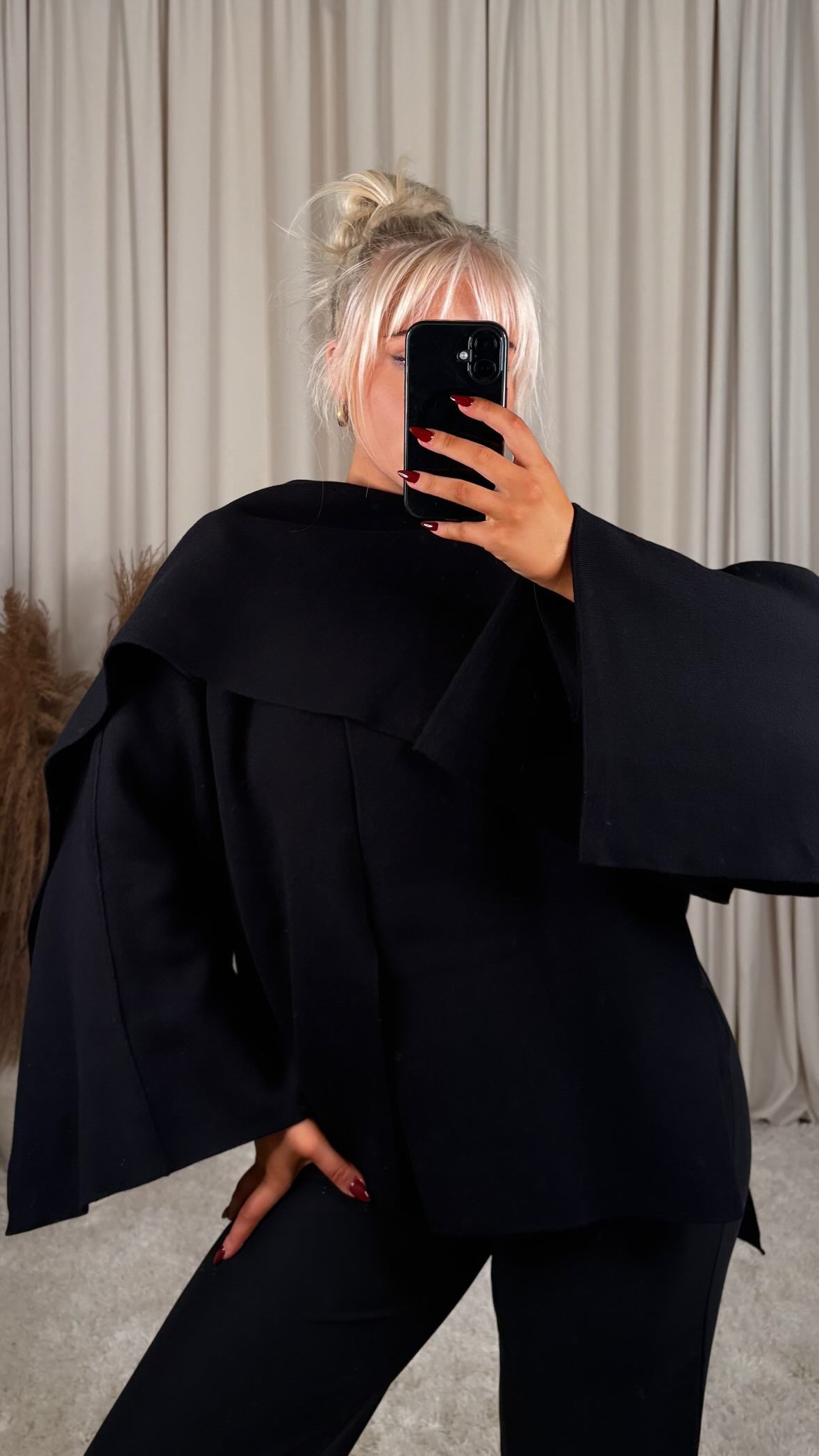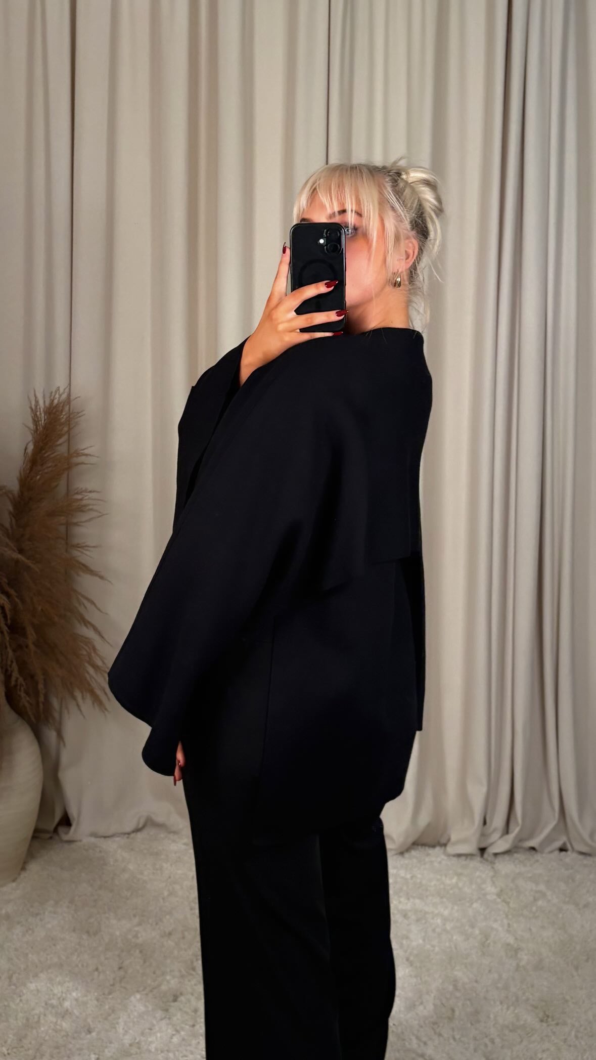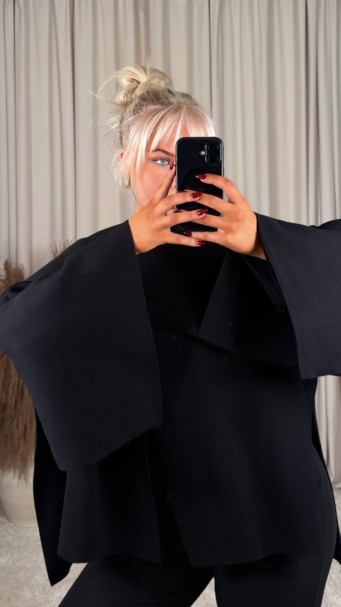 Sjúklega flottur jakki úr mjög þæginlegu efni, þá er góð teygja í efninu og er oversized í sniði jakkinn er one size og passar á S-M-L modelið er 168cm og er í stærð S