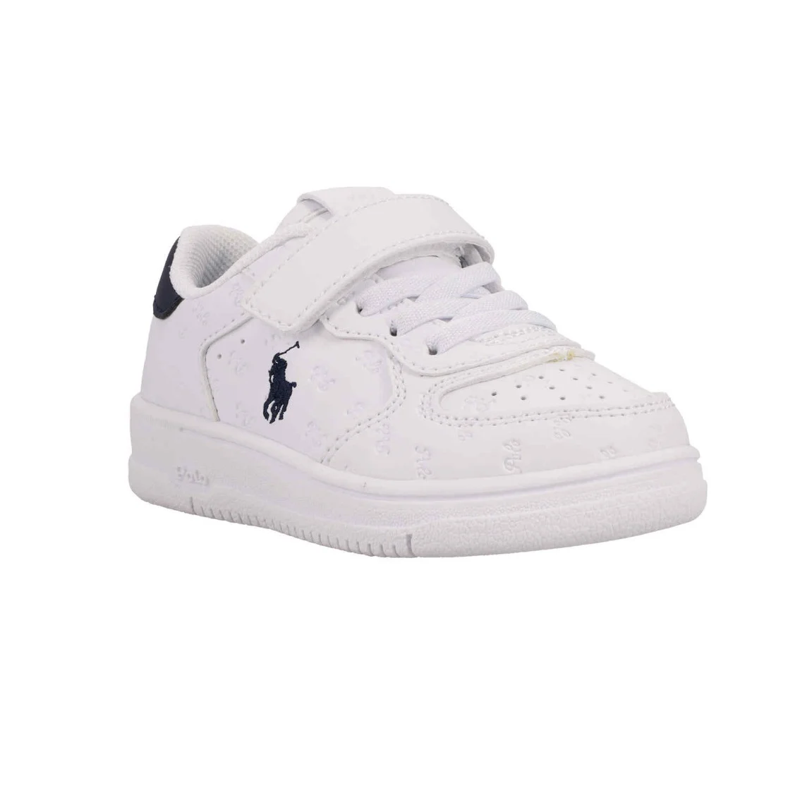 Hvítir logo strigaskór frá Polo Ralph Lauren með dökk bláum hælkappa og útsaumuðu logo á hliðum. Skórnir lokast með frönskum rennilás.