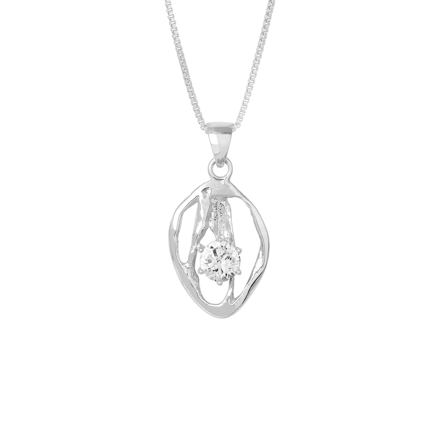 Hálsmenið er handsmíðað úr rhodiumhúðuðu silfri með cubic zirconia steini. Hæð mensins er um 21 mm. Hönnuður og smiður er Berglind Snorra.