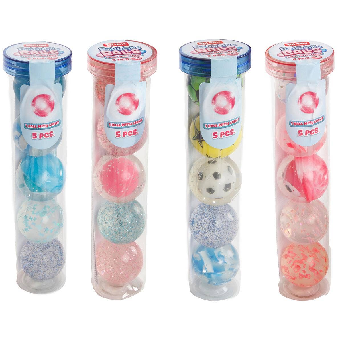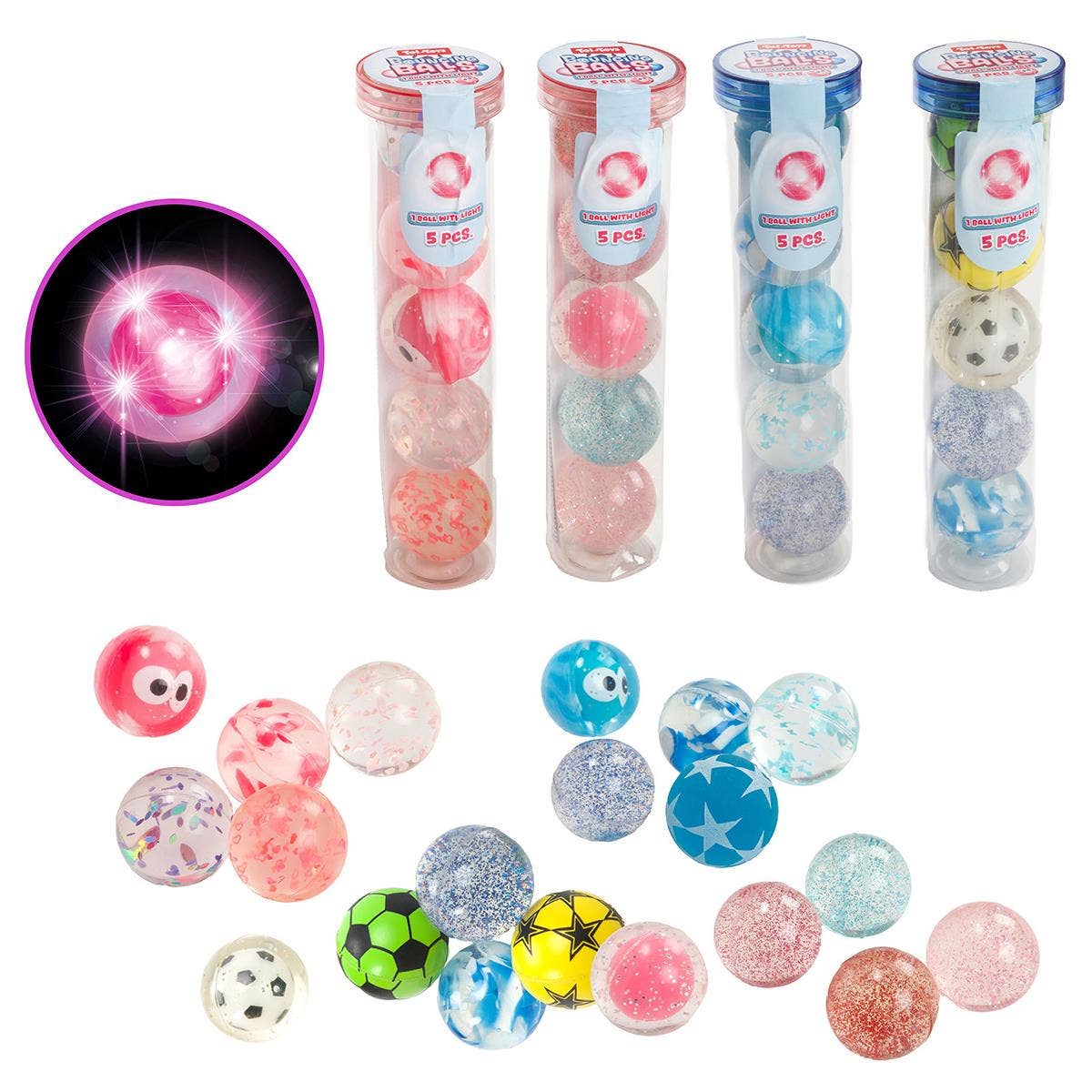 Túpa með 5 skemmtilegum skopparaboltum, þ.m.t. einum með ljósi.
