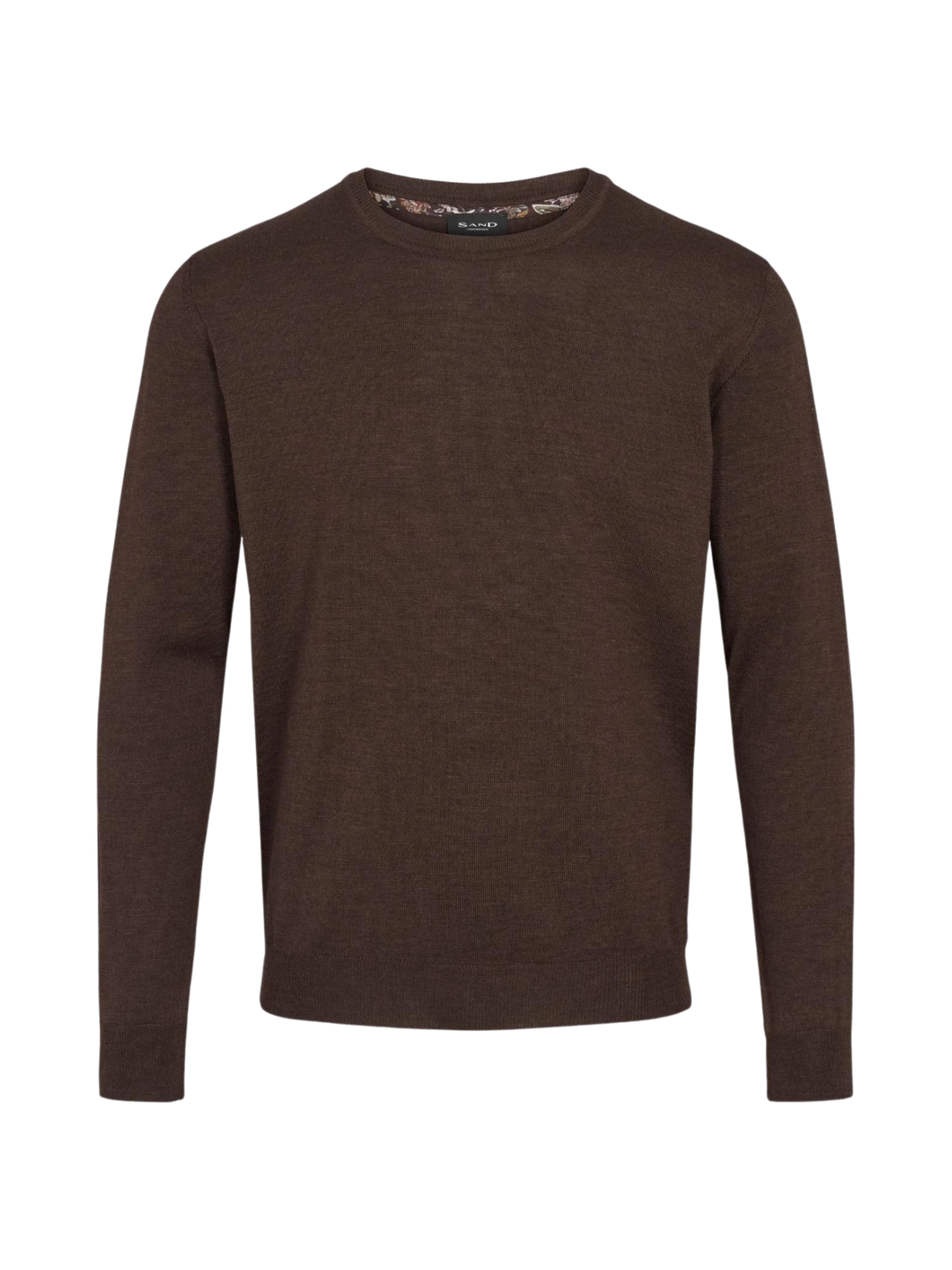 Modern fit sweater with round neck Merino extra fine wool Made in Italy Rib at neck, hem and cuffs Fit: True to size 100% Merino Wool
