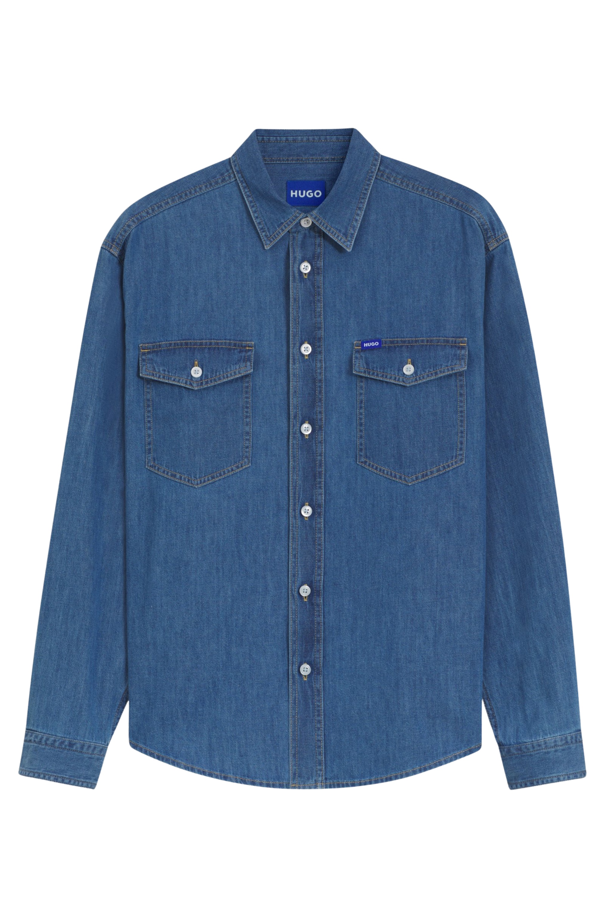 A casual shirt crafted in blue cotton denim by HUGO Menswear. This loose-fit piece features stitching and signature detailing. Oversize fit Kent collar Flap chest pockets Squared cuffs ... Sjá nánar