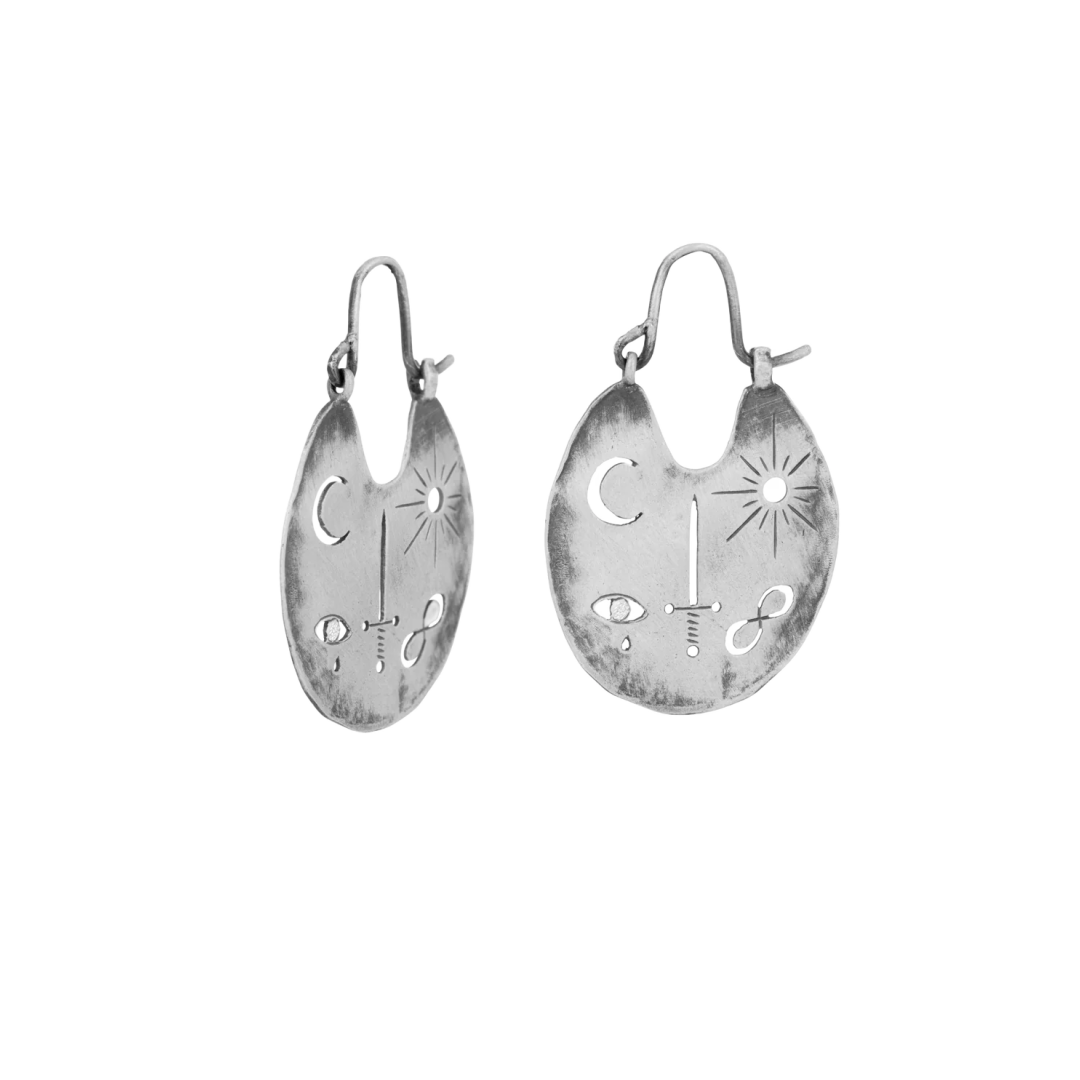 Flat silver earrings with cut out symbols. The symbols are: The Moon, The Sun, The Sword, Eternity and The weeping eye.Length (front) = 3.5 cm / 1.4 inchesAlso available in bronzeMaterials & ... Sjá nánar