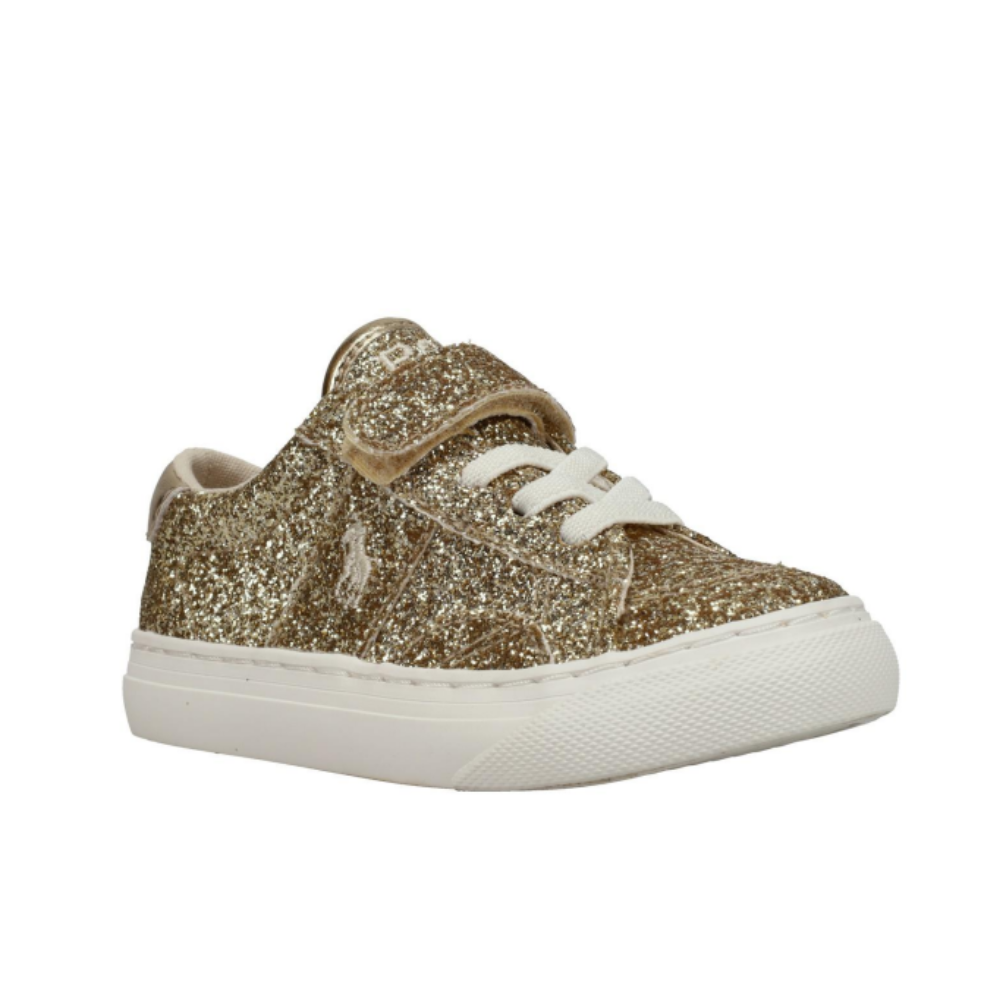 Gylltir glimmer strigaskór frá Polo Ralph Lauren. Skórnir lokast með frönskum rennilás.