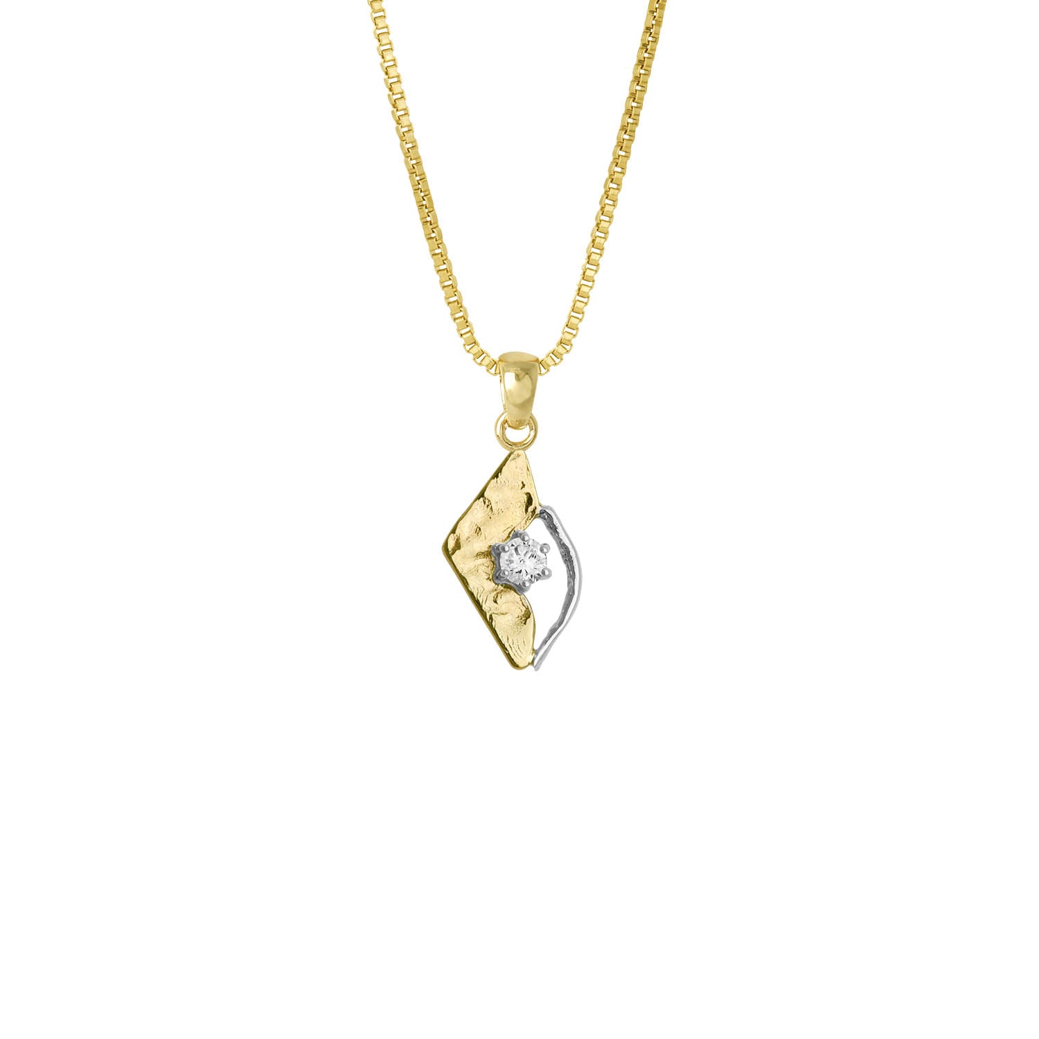 Hálsmenið er handsmíðað úr 14 karta gulli og hvítagulli með 10 punkta demanti í TW VS1 gæðum.  Þegar talað er um stærð (og þar með þyngd) demanta er ýmist notast við karöt eða punkta. 10 ... Sjá nánar