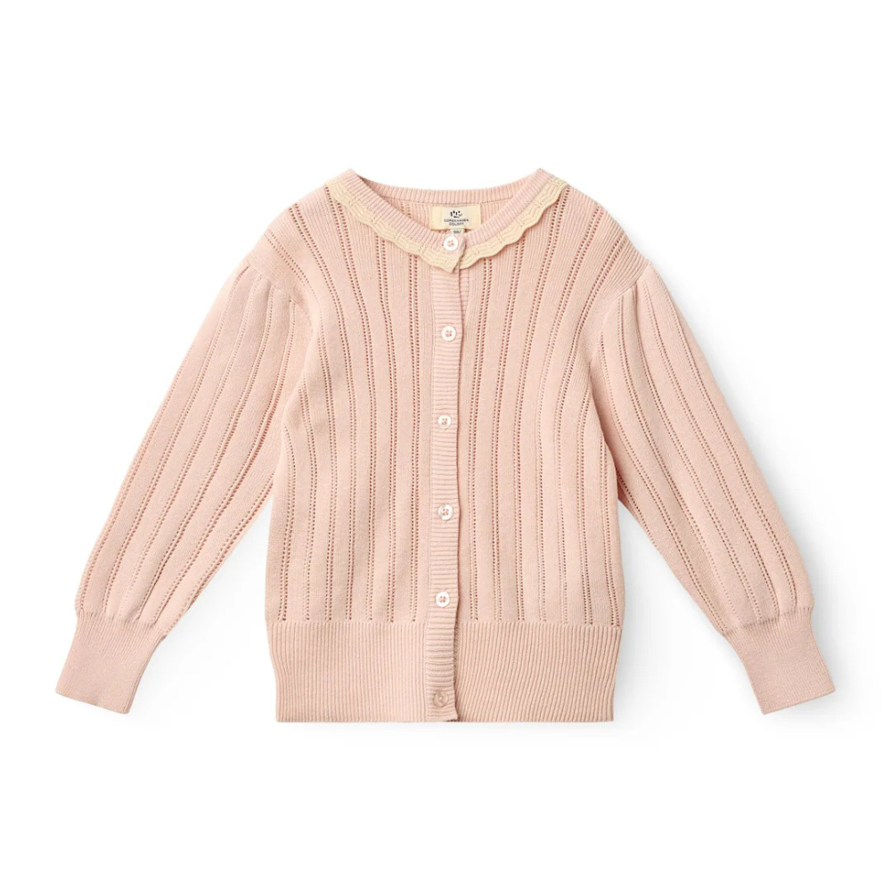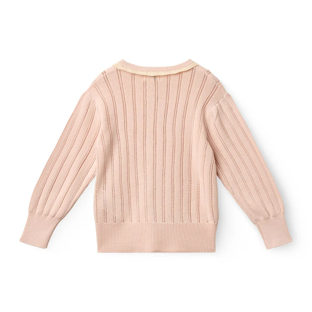 Ljós bleik, hneppt peysa með pífukraga og smáu gatamynstri frá Copenhagen Colors. 100% bómull.