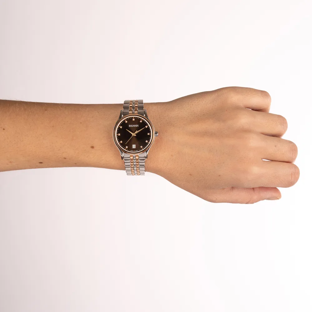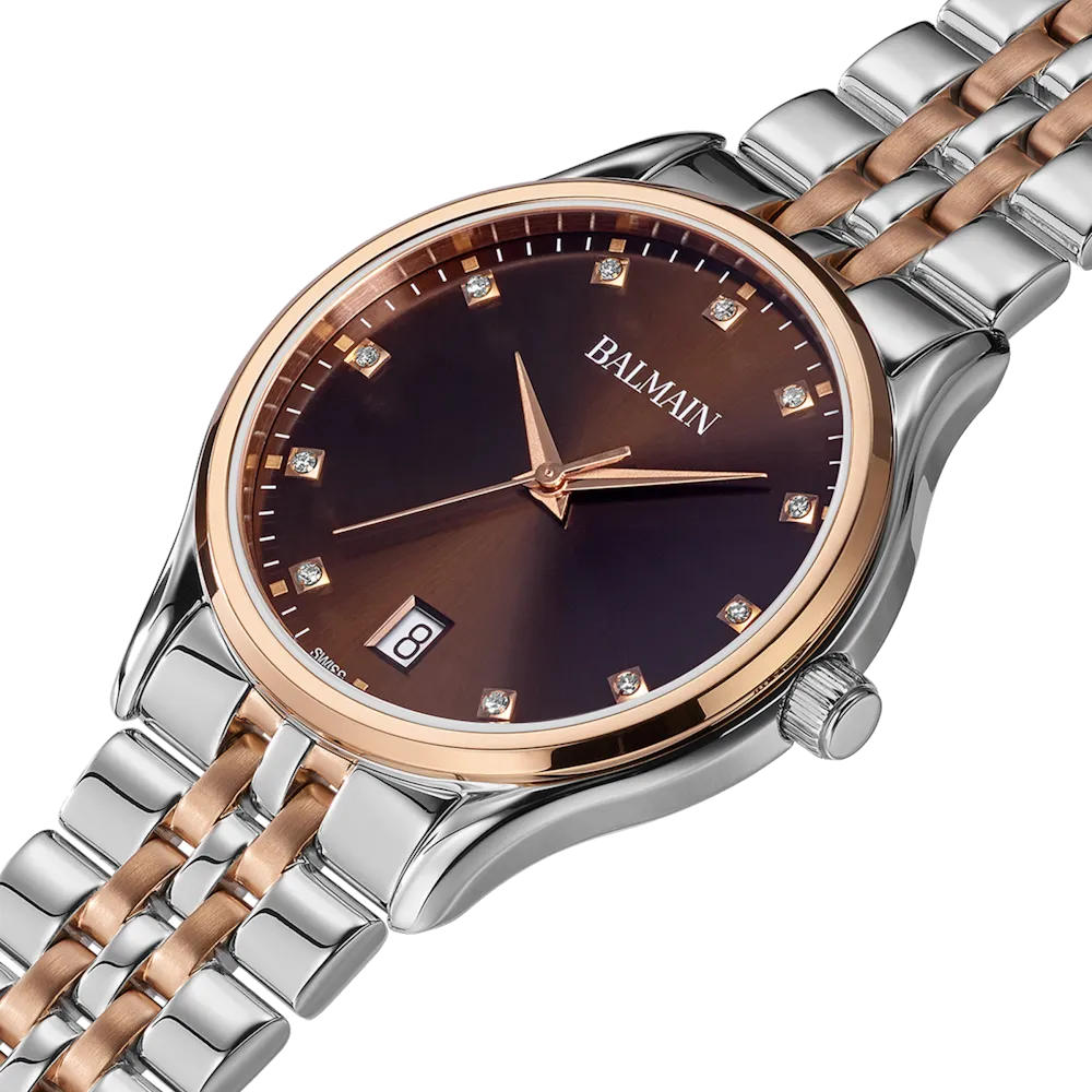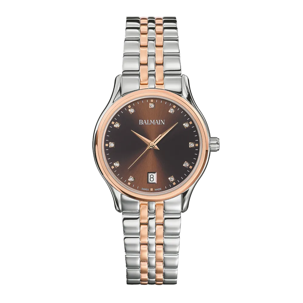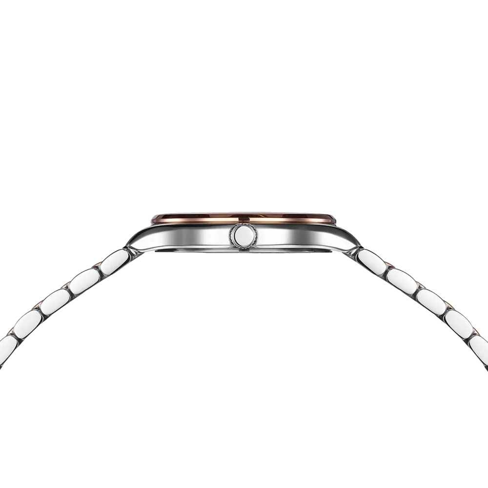 Úrkassi: 32mm – stál & rauðagyllt stál Úrverk: Rafhlaða – svissneskt Vatnsvörn: 30M Skífa: Brún – 11 demantar (Top Wesselton VS-SI – 0,041ct) – dagsetning hjá kl 6 – vísar Gler: Safírgler – ... Sjá nánar