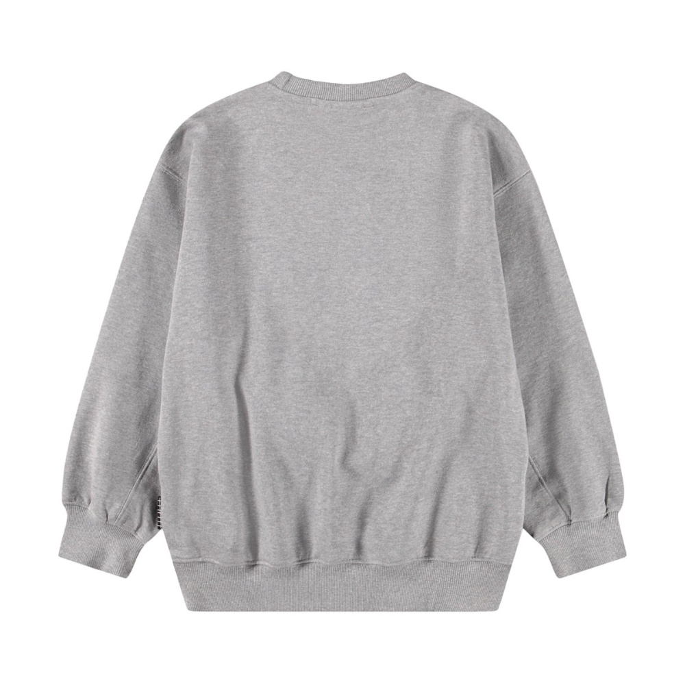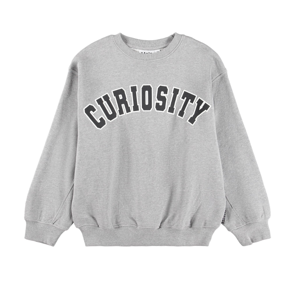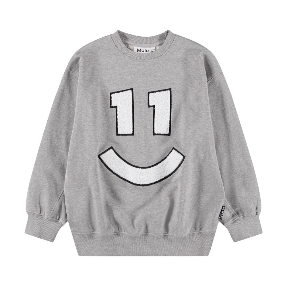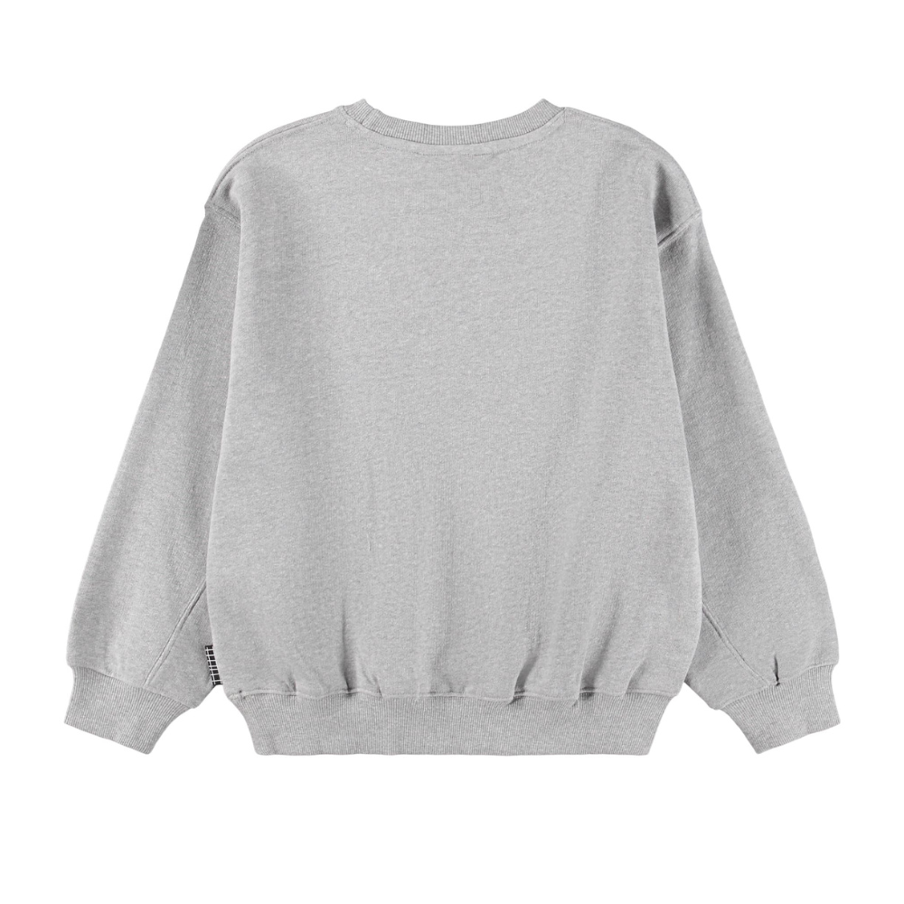 Grá peysa frá Molo með stöfum að faman. Peysan er með stroffi við hálsmál, ermar og mitti. 100% bómull.