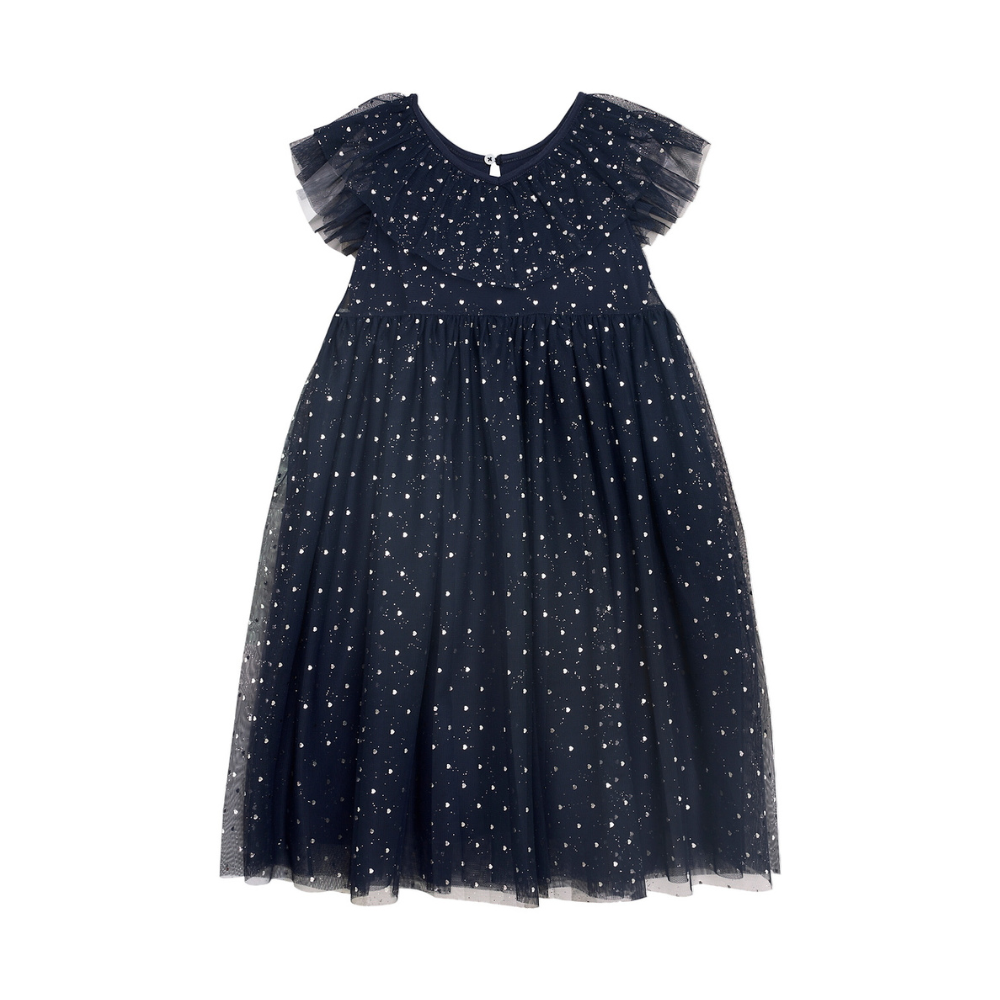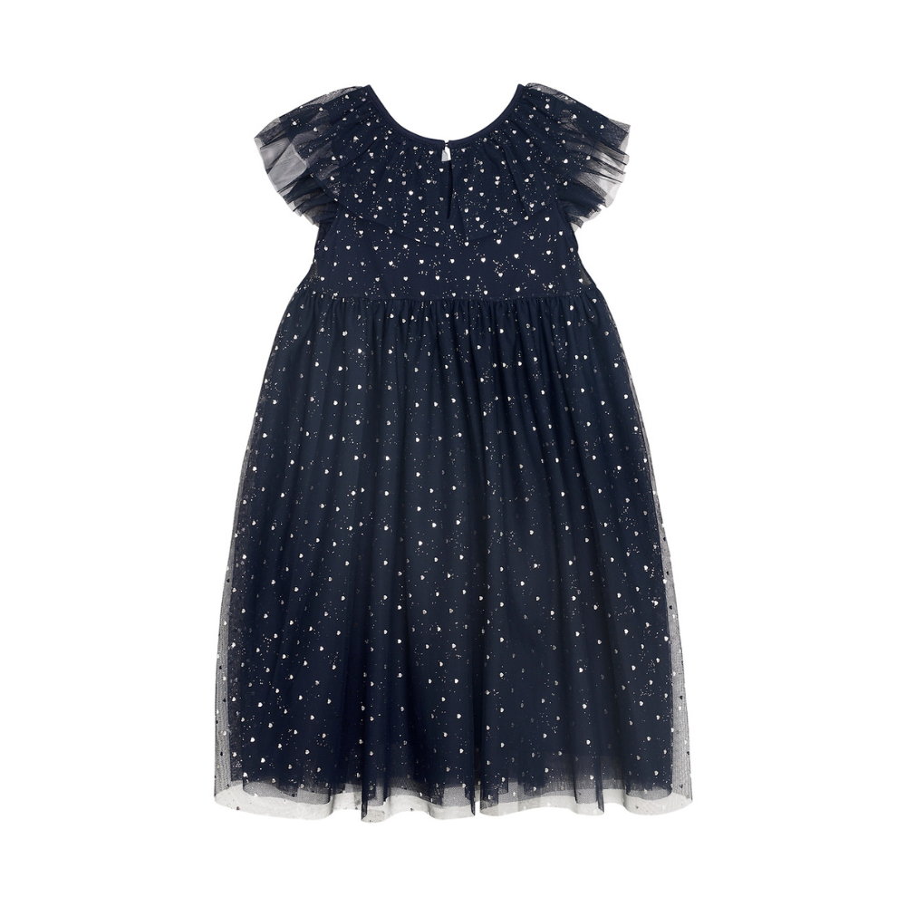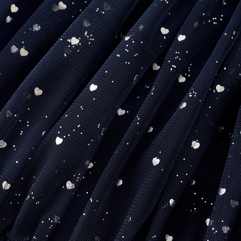 Fallegur, dökk blár, ermalaus kjóll frá Creamie með silfruðu pallíettu skrauti. 100% polyester.