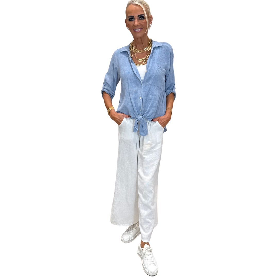 Ljósblá hörskyrta bundin að framan