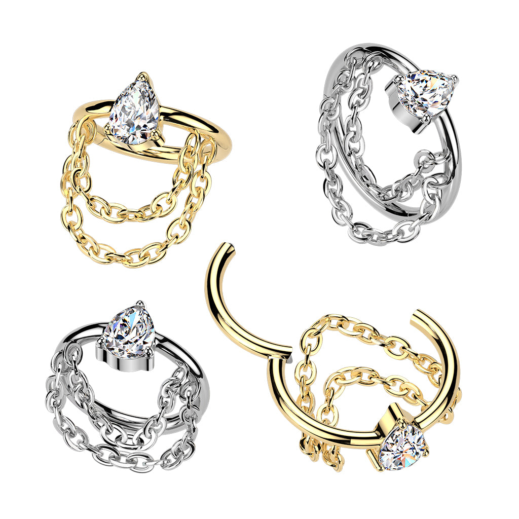 Smelluhringur með dropalaga steini og hangaði keðjum. Gerður úr titanium og PVD húðaður.  Passar í t.d. Helix, Forward Helix, Rook, Daith, Eyrnasnepla, Conch og fl. göt. Lokkurinn er 8mm og ... Sjá nánar