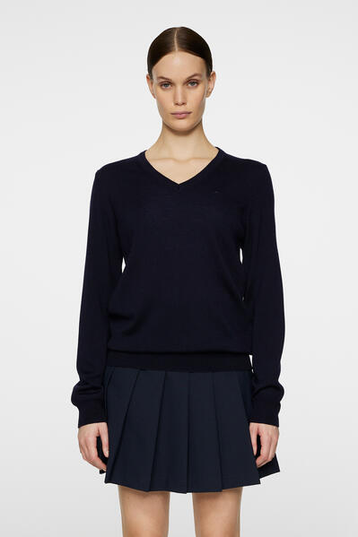Flott golf ullarpeysa frá J. Lindeberg með v-hálsmáli í navy blue lit .