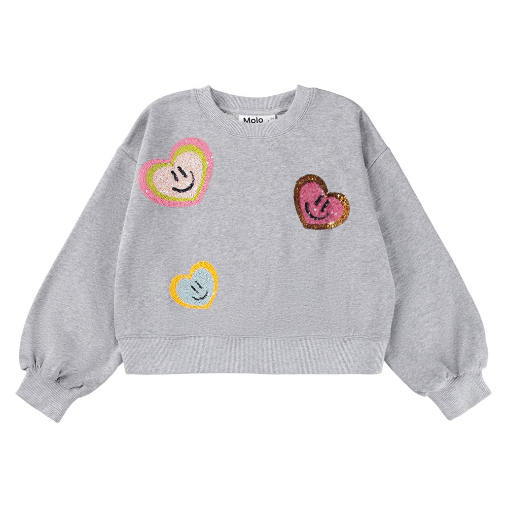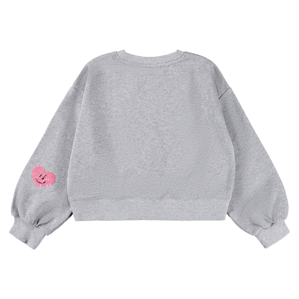 Grá peysa meðsætum palliettu myndum. Stroff við ermar og mitti. 100% bómull.