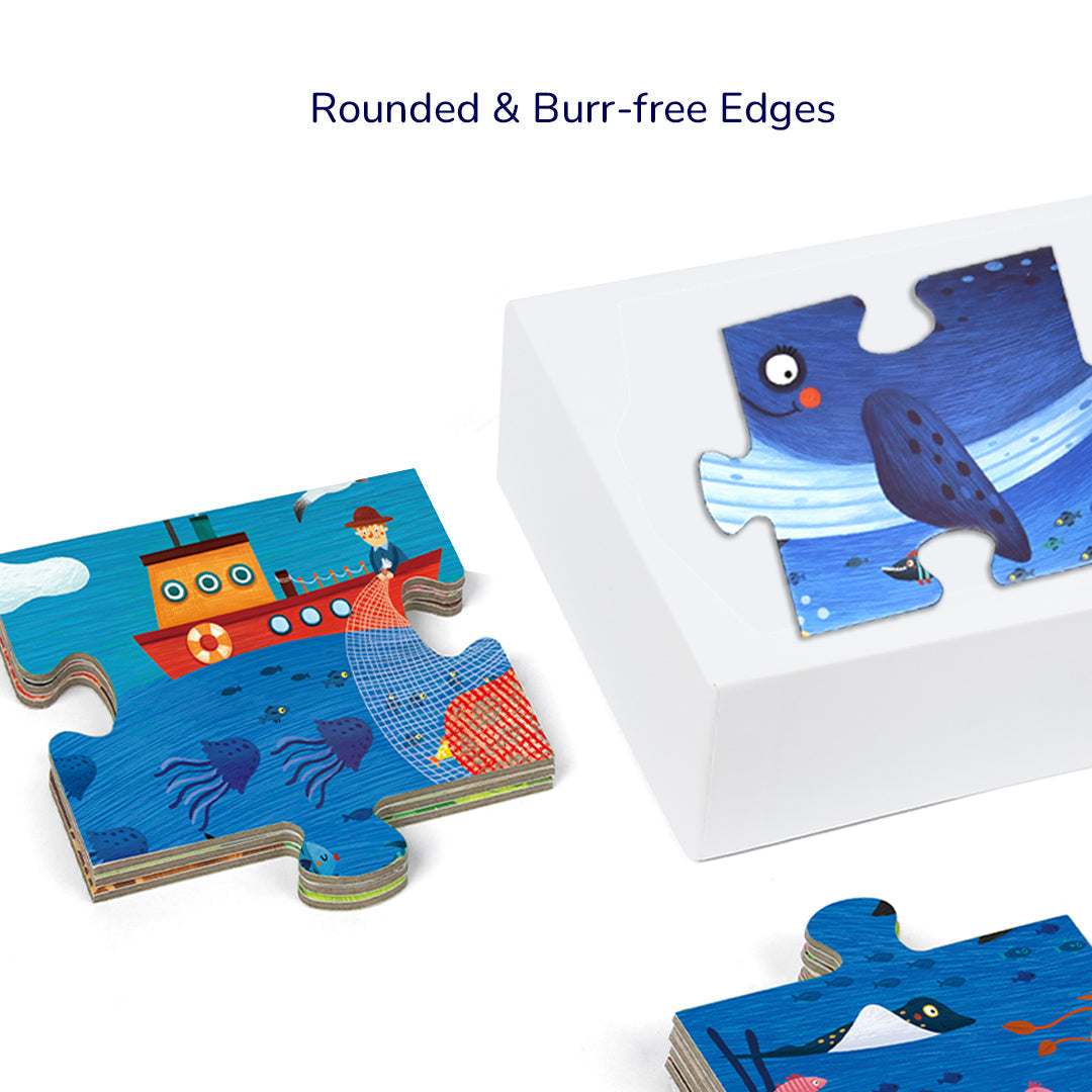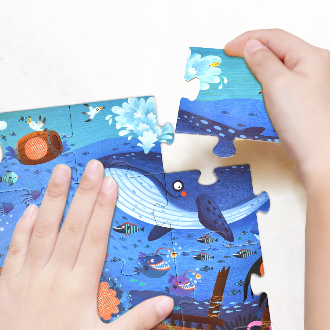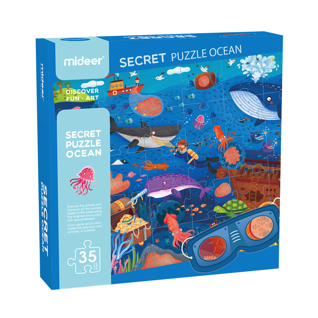 Mideer® Leynipúsl – Hafið Þetta 35 bita púsl kemur með sérstökum gleraugum sem sýna falin dýr og leyndarmál í myndinni. Skemmtilegt og fræðandi púsl. Aldur: 3+