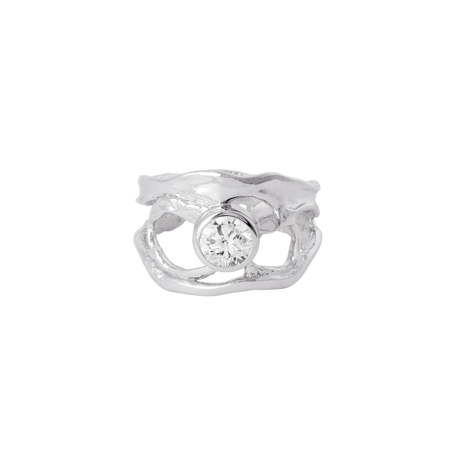 Hringurinn er handsmíðaður úr rhodiumhúðuðu silfri með  cubic zirconia steini. Breidd hringsins er um 14 mm. Hönnuður og smiður er Berglind Snorra.