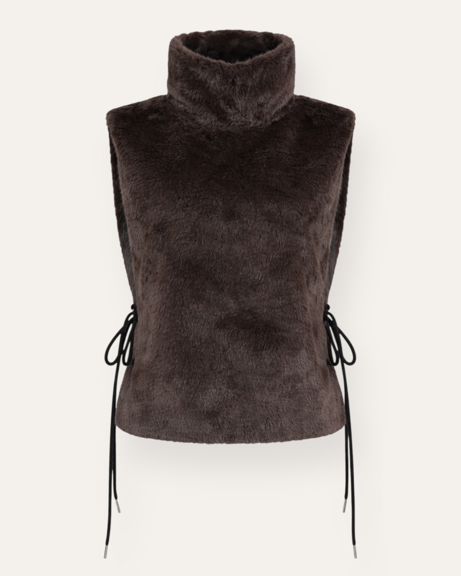 Loðvesti með reimum á hliðum Mjúkt og stílhreint loðvesti með háu hálsmáli og opnum hliðum með reimum sem hægt er að stilla. Vestið er bæði hlýtt og létt og gefur flott layered útlit yfir ... Sjá nánar