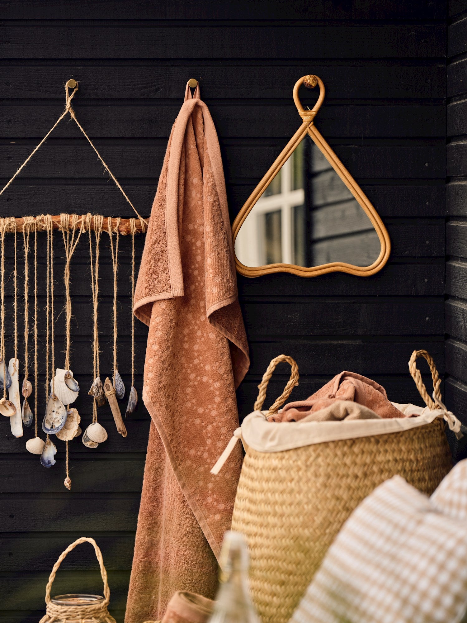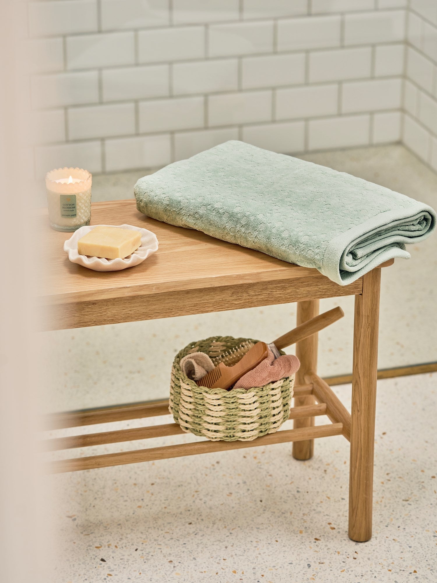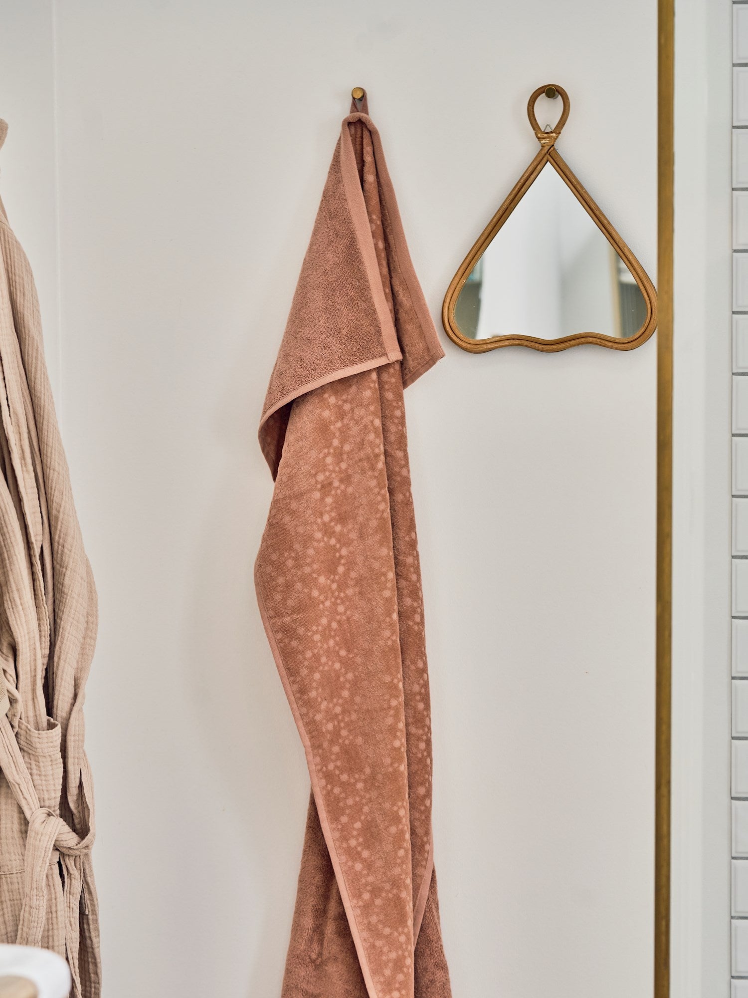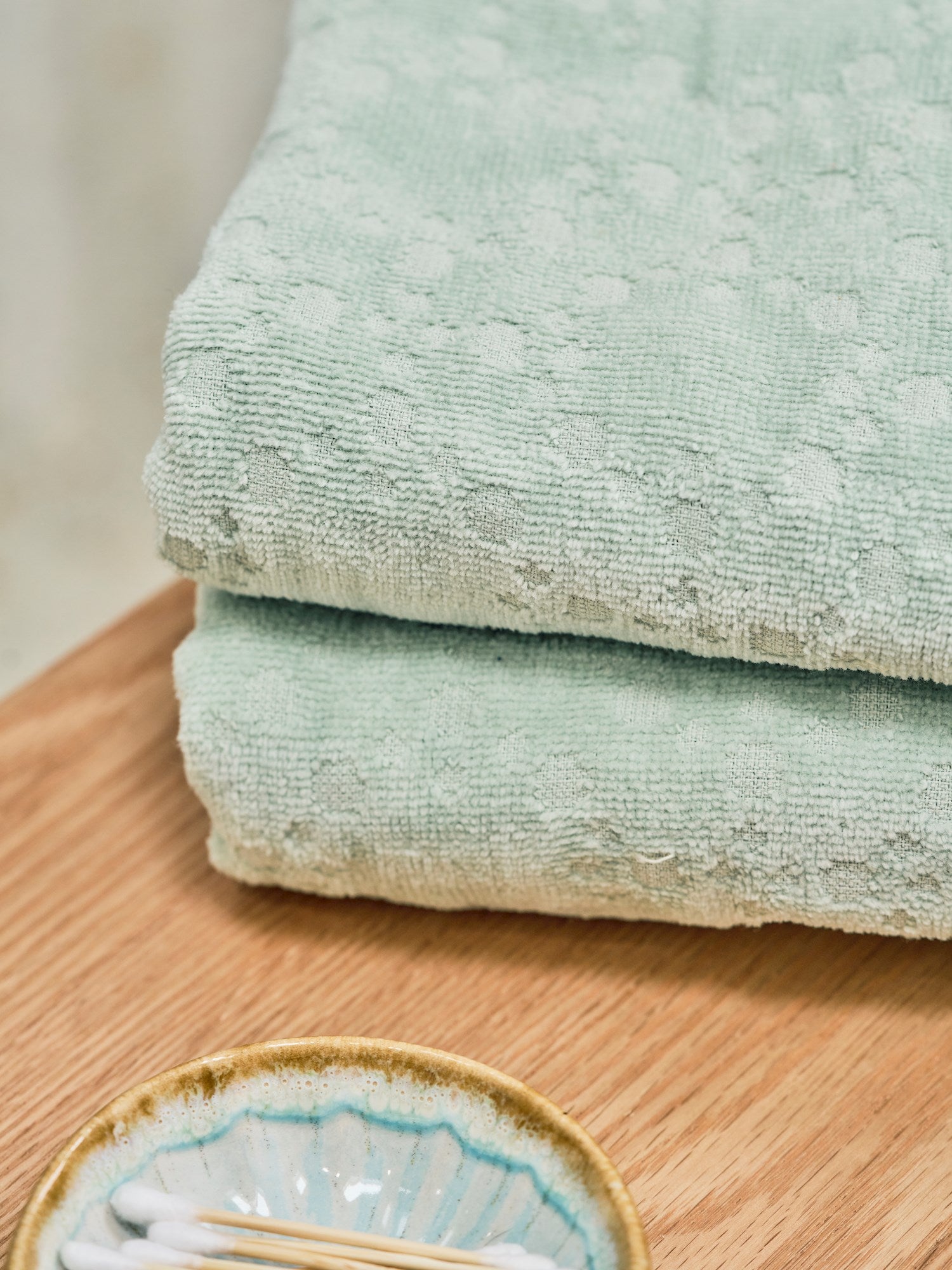 Spring feelings Anna hangs a fresh towel by the bath and pats it flat. "Looks inviting," she muses. Clara folds the spare stack and replies, "And it dries you quickly, as it should."