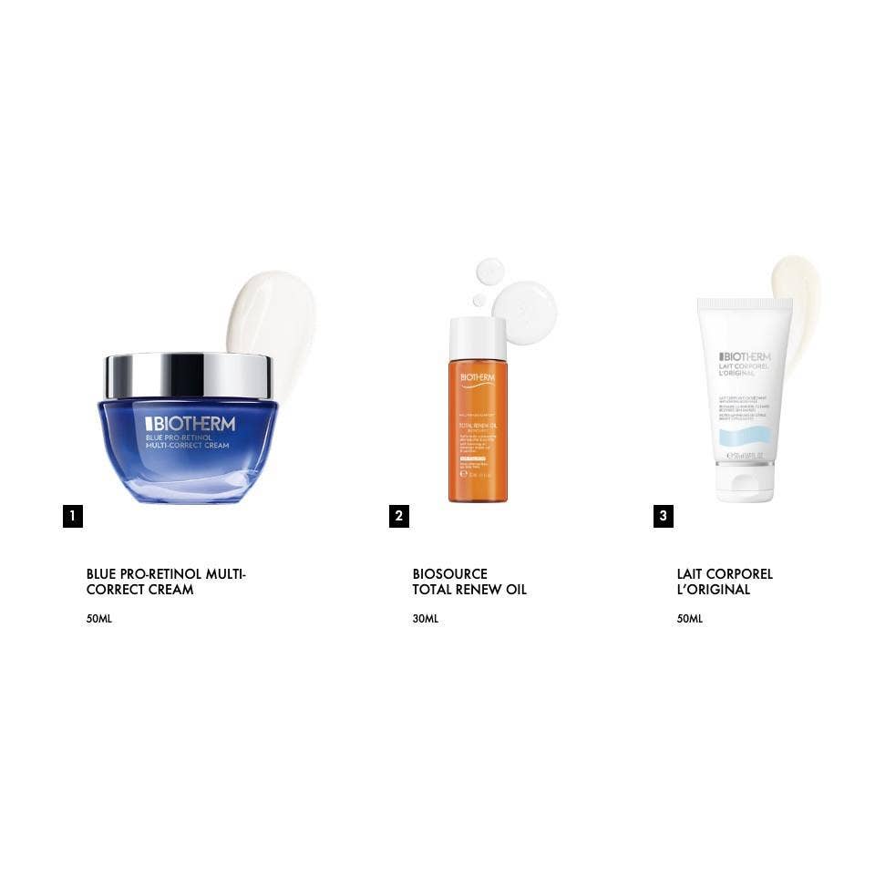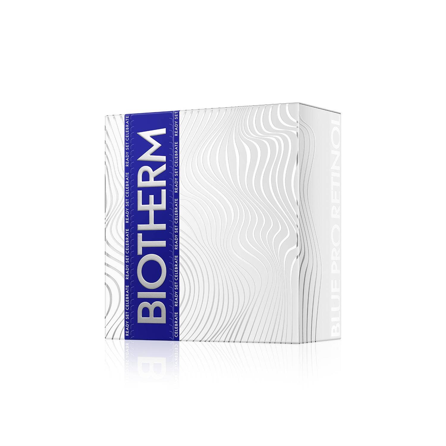 Hátíðar gjafaaskja með 50 ml Blue Therapy Pro-Retinol Cream, 30 ml Oil Cleanser og 50 ml Lait Corporel body lotion.