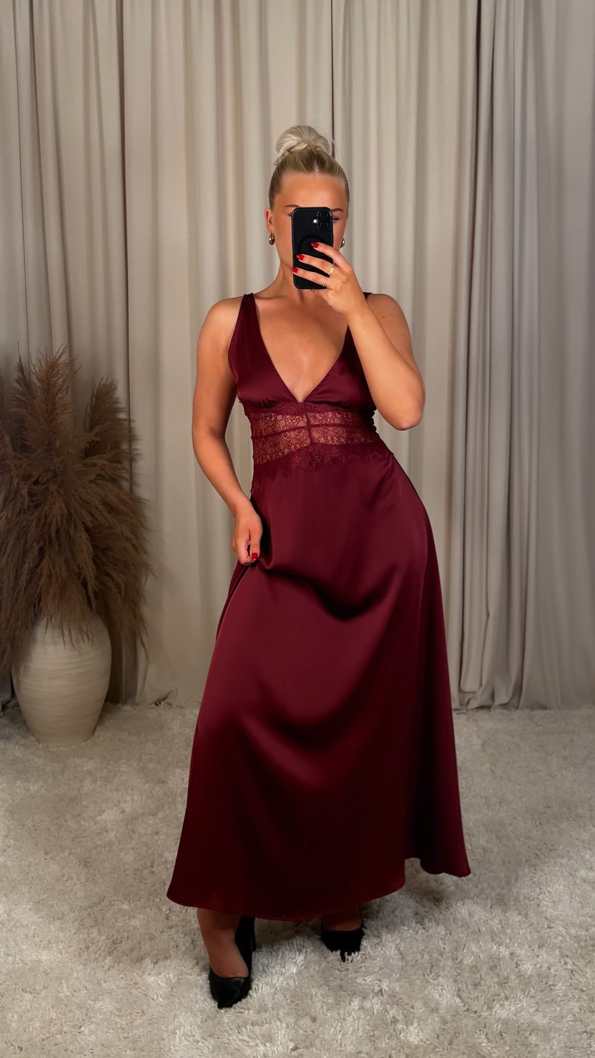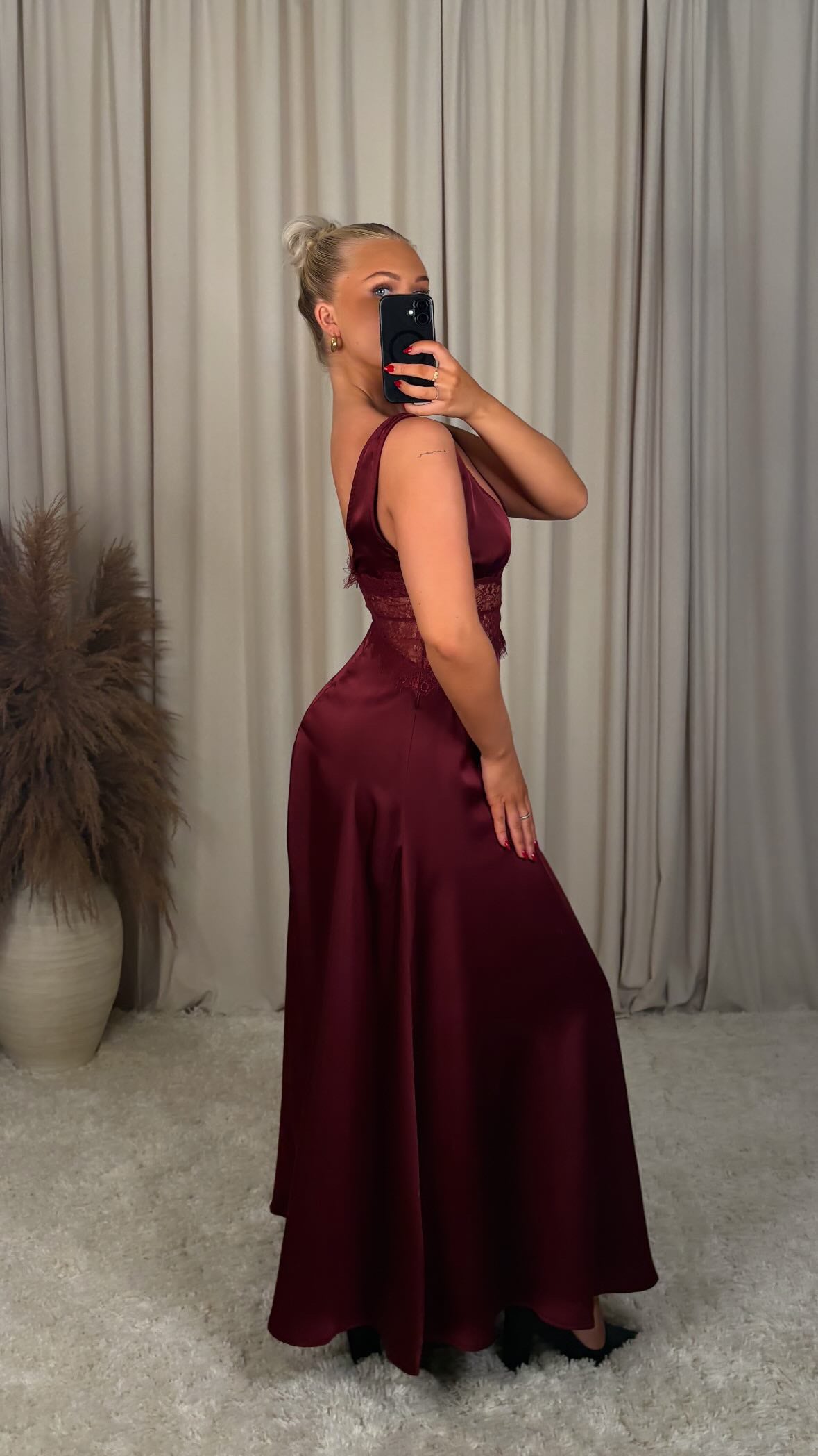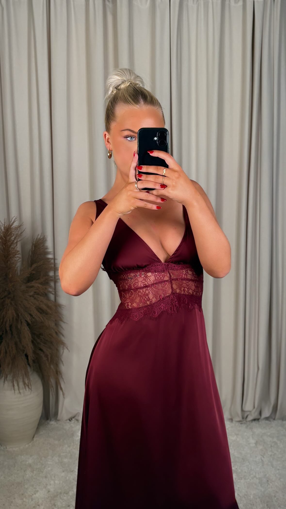 Æðislega fallegur satín kjóll með blúndu, það er engin teygja í efninu og er með rennilás að aftan  modelið er 168cm og er í stærð S