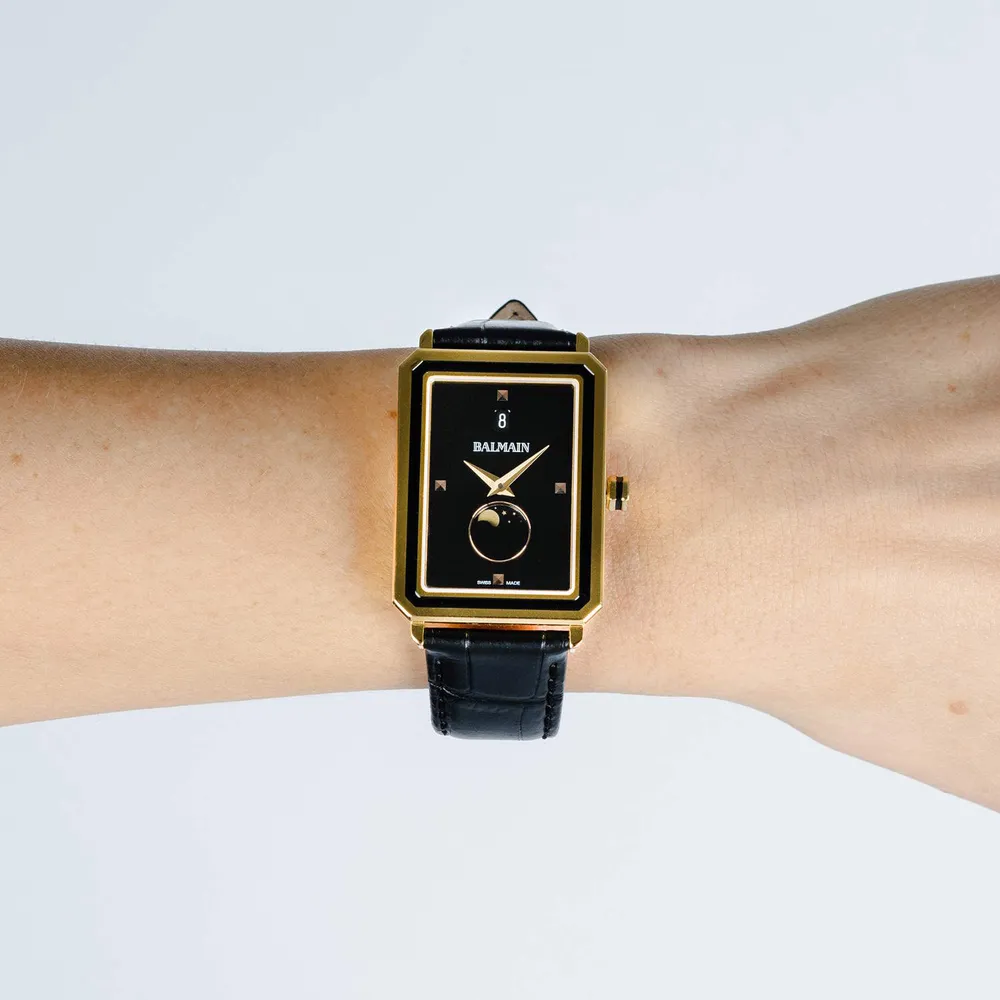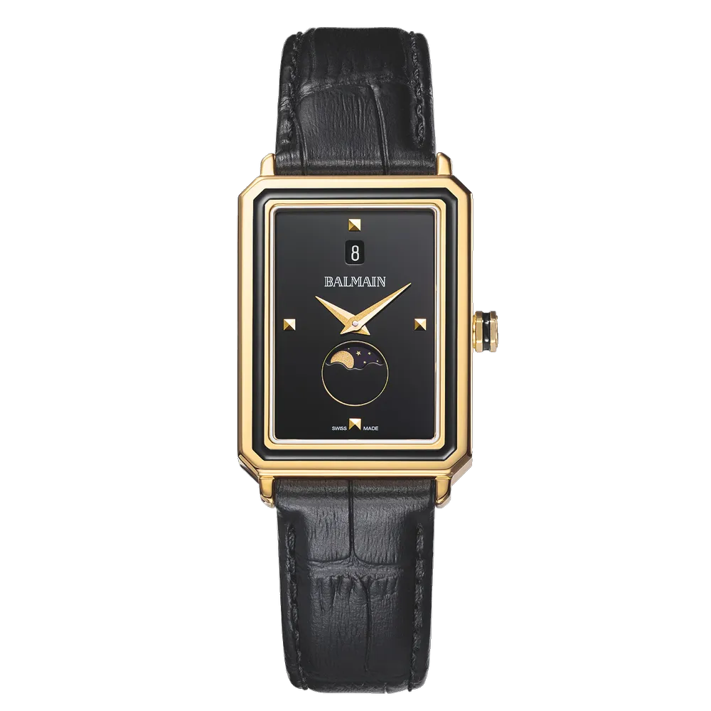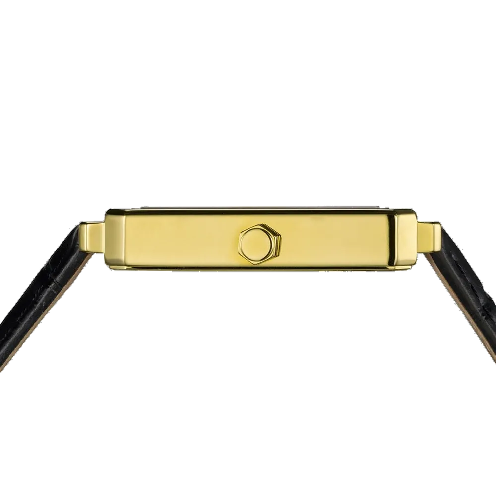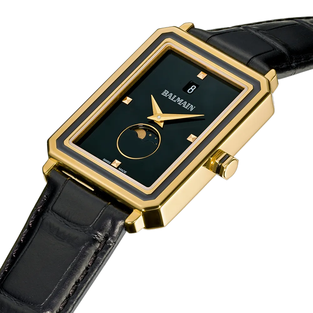Úrkassi: 28 x 37mm – gyllt stál Úrverk: Rafhlaða – svissneskt - tunglstaða Vatnsvörn: 30M Skífa: Svört – áfest klukkustundamerki – vísar Gler: Safírgler – speglunarvörn Ól: Leður – öryggislás ... Sjá nánar