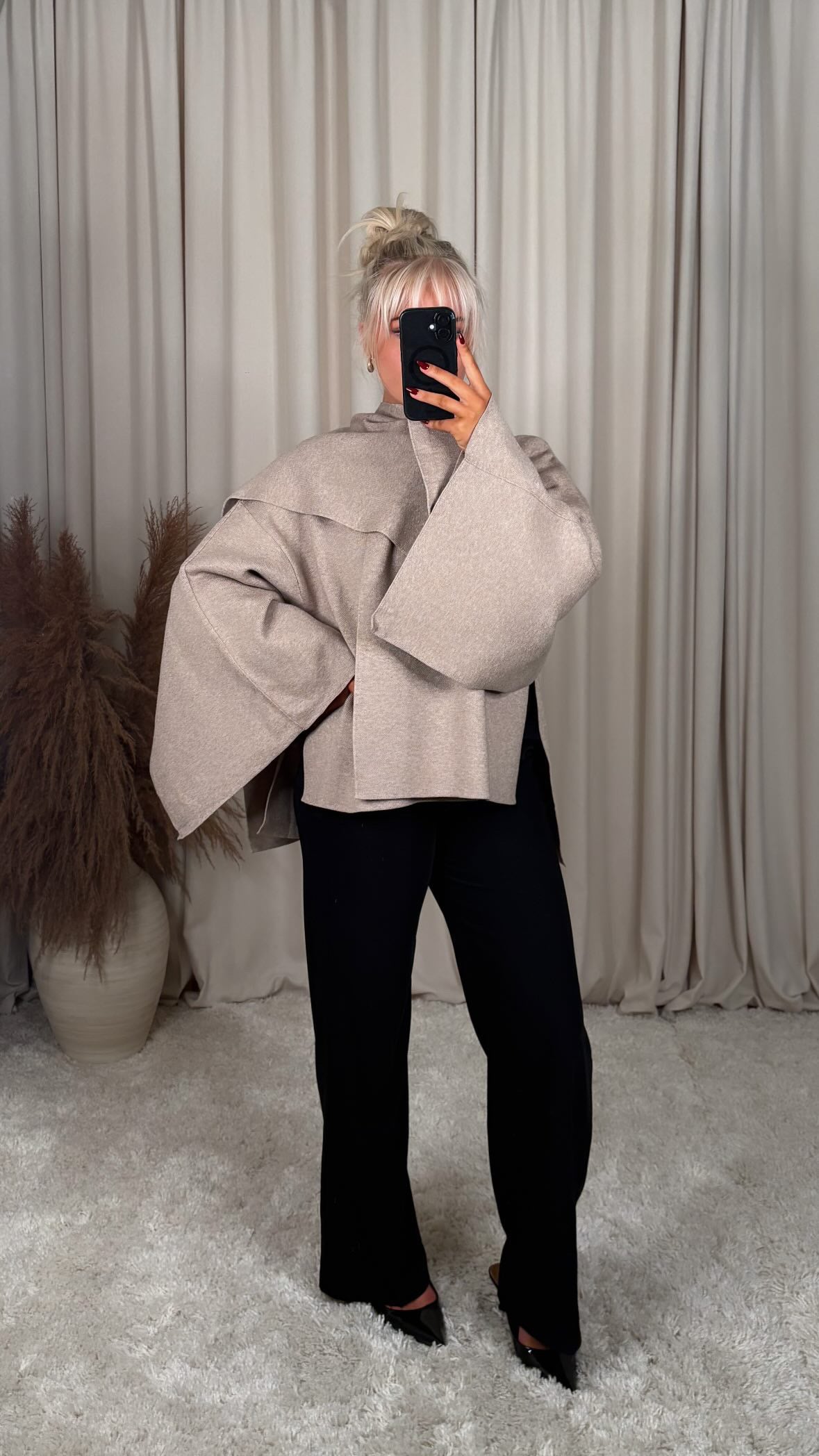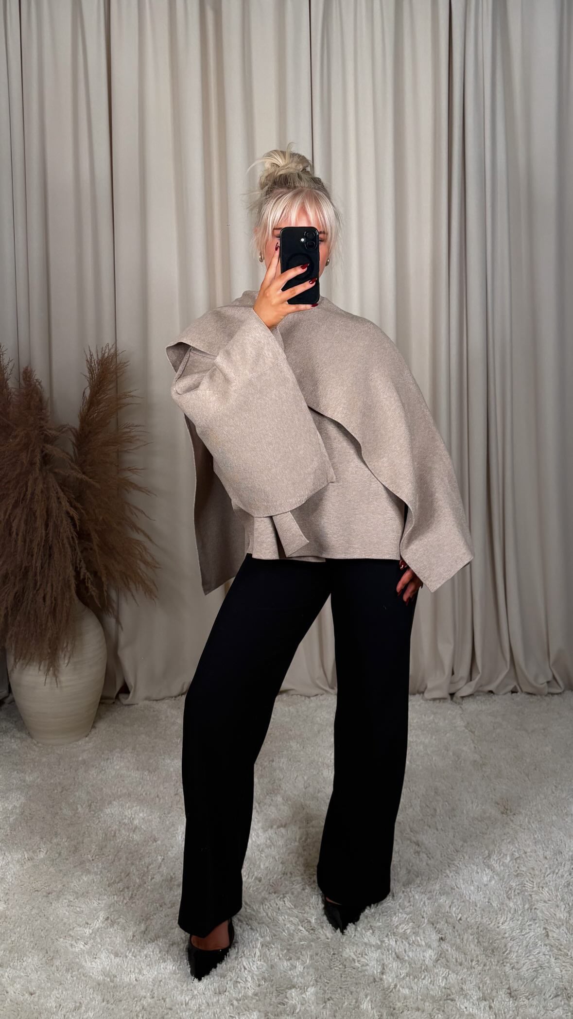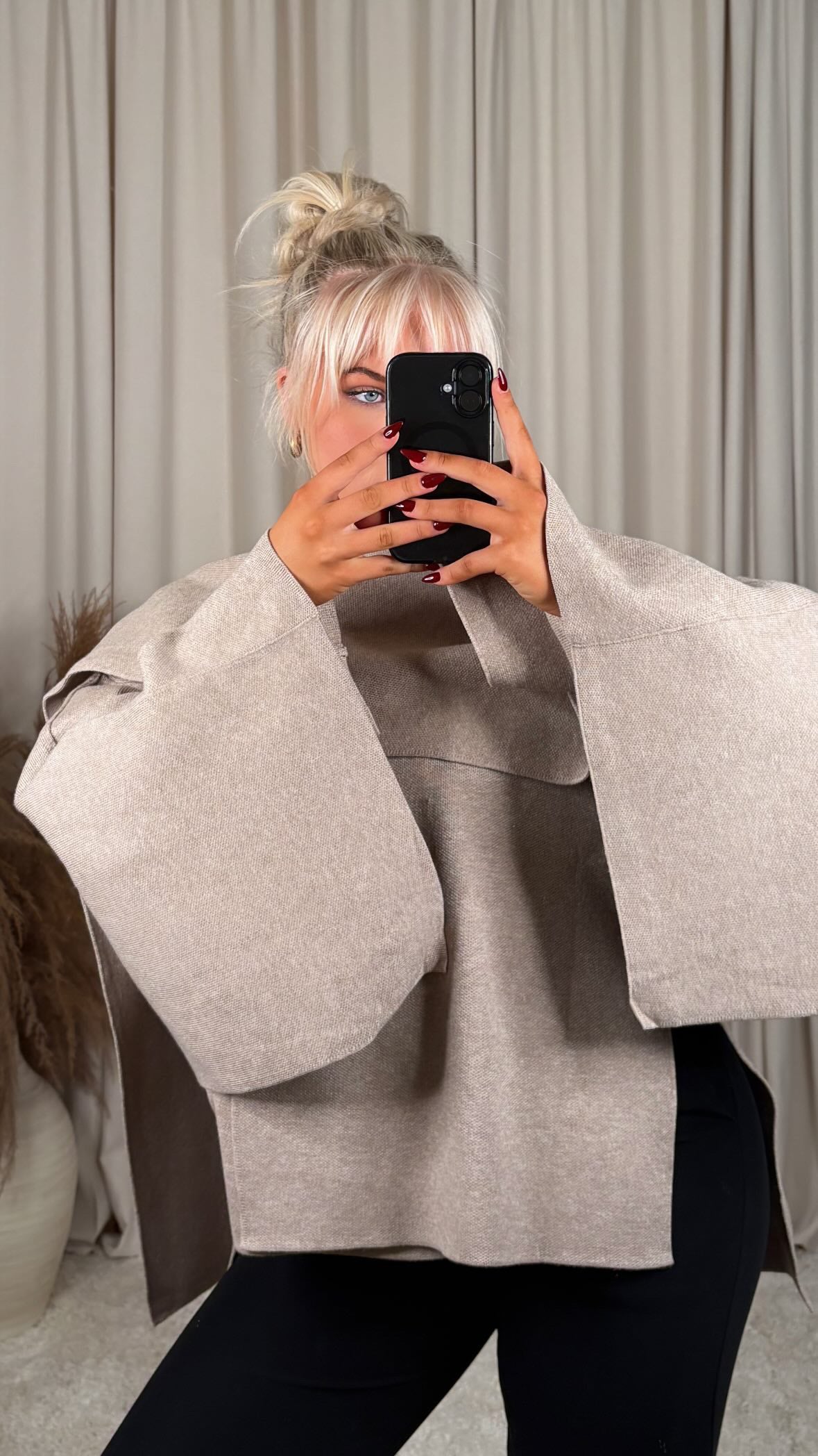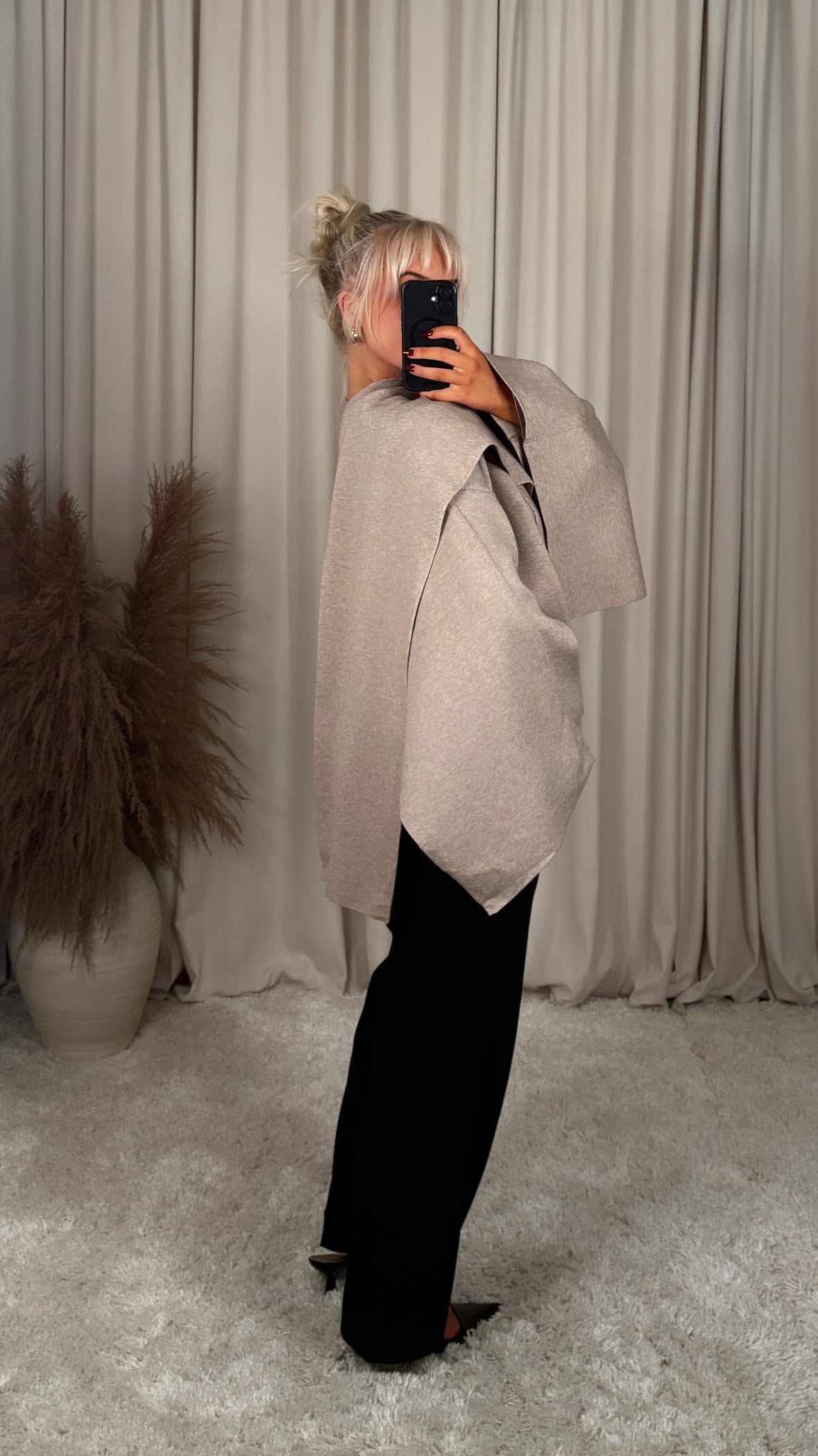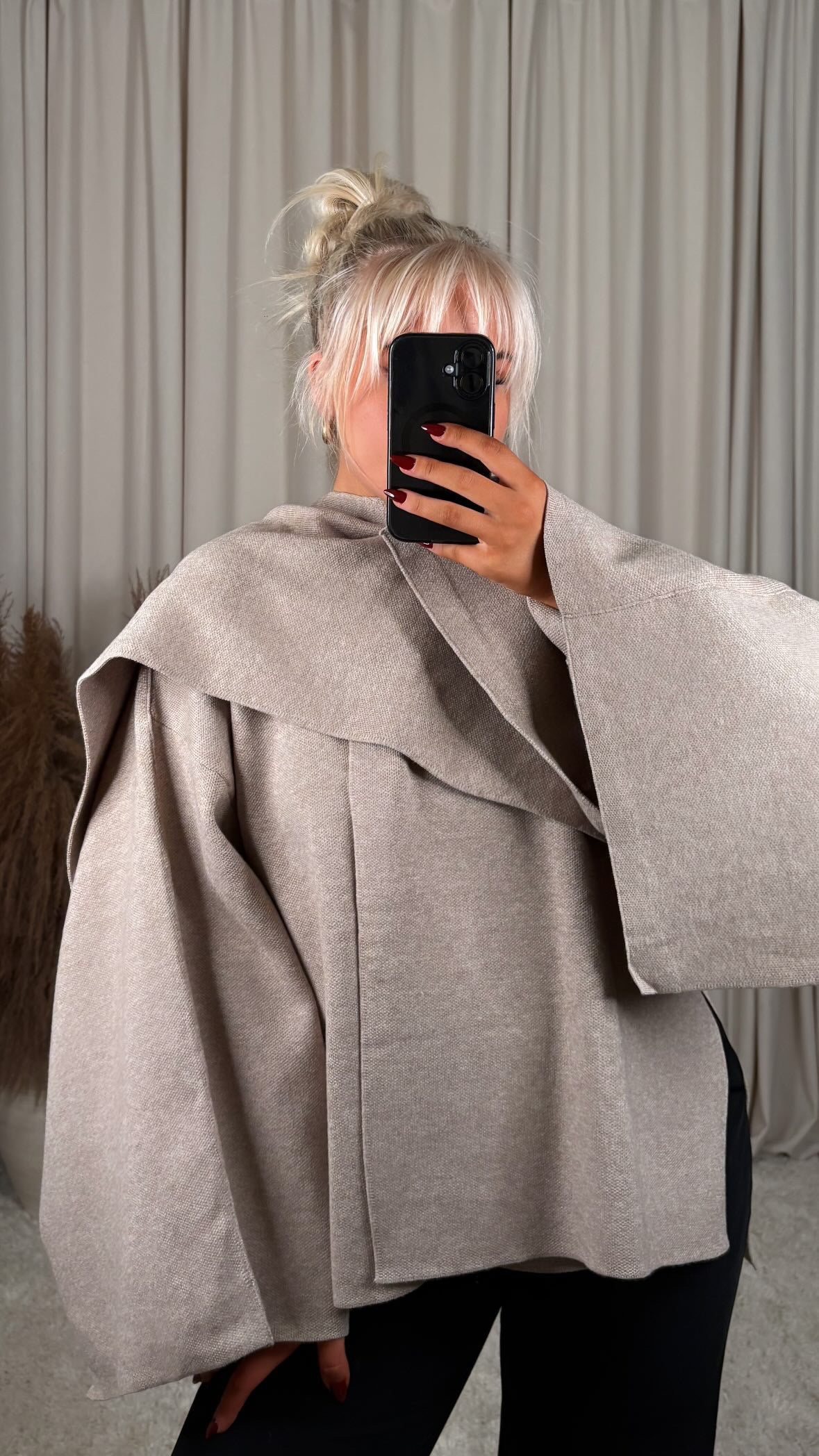Sjúklega flottur jakki úr mjög þæginlegu efni, þá er góð teygja í efninu og er oversized í sniði jakkinn er one size og passar á S-M-L modelið er 168cm og er í stærð S
