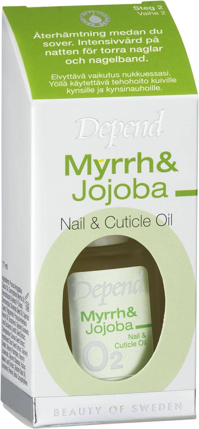 Depend Myrrh & Jojoba Nagla og Naglabanda olian gefur verndandi húð yfir neglurnar sem bæði nærir og styrkir.
