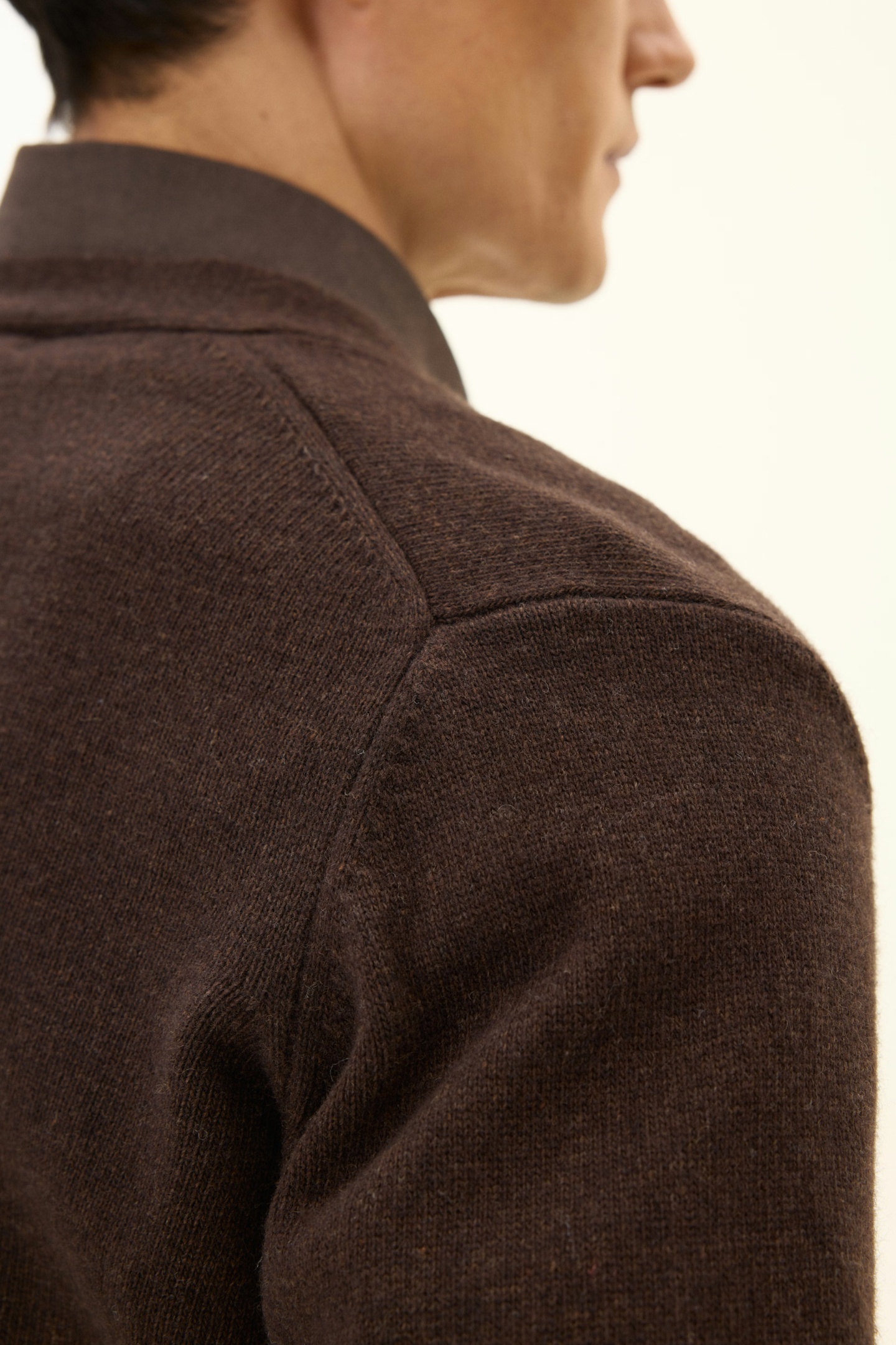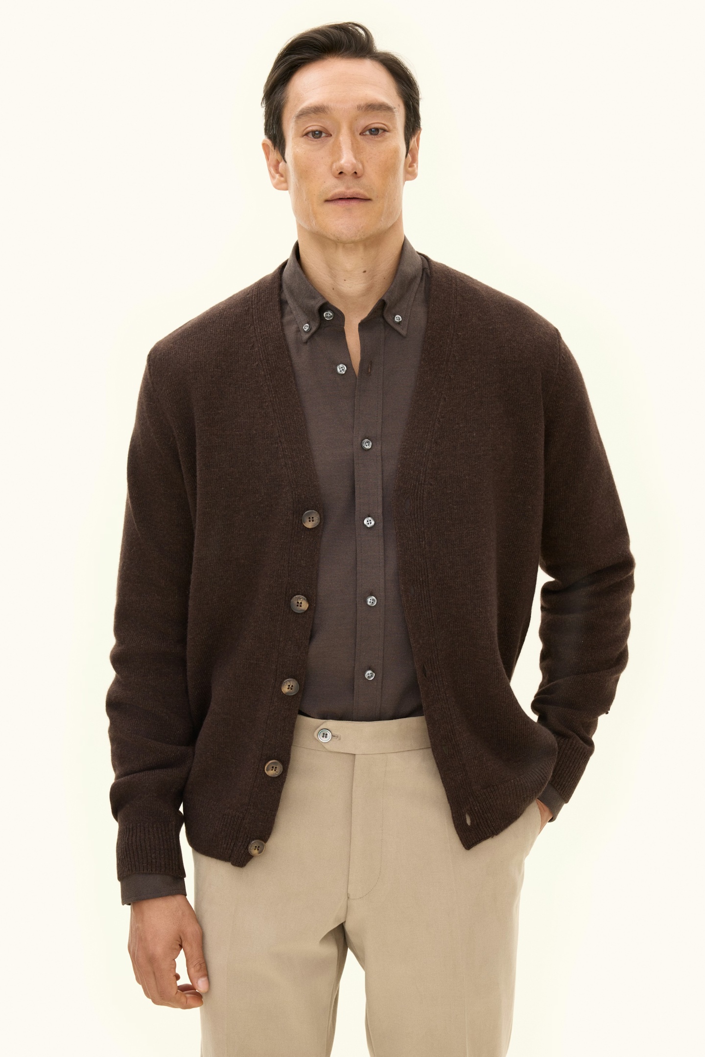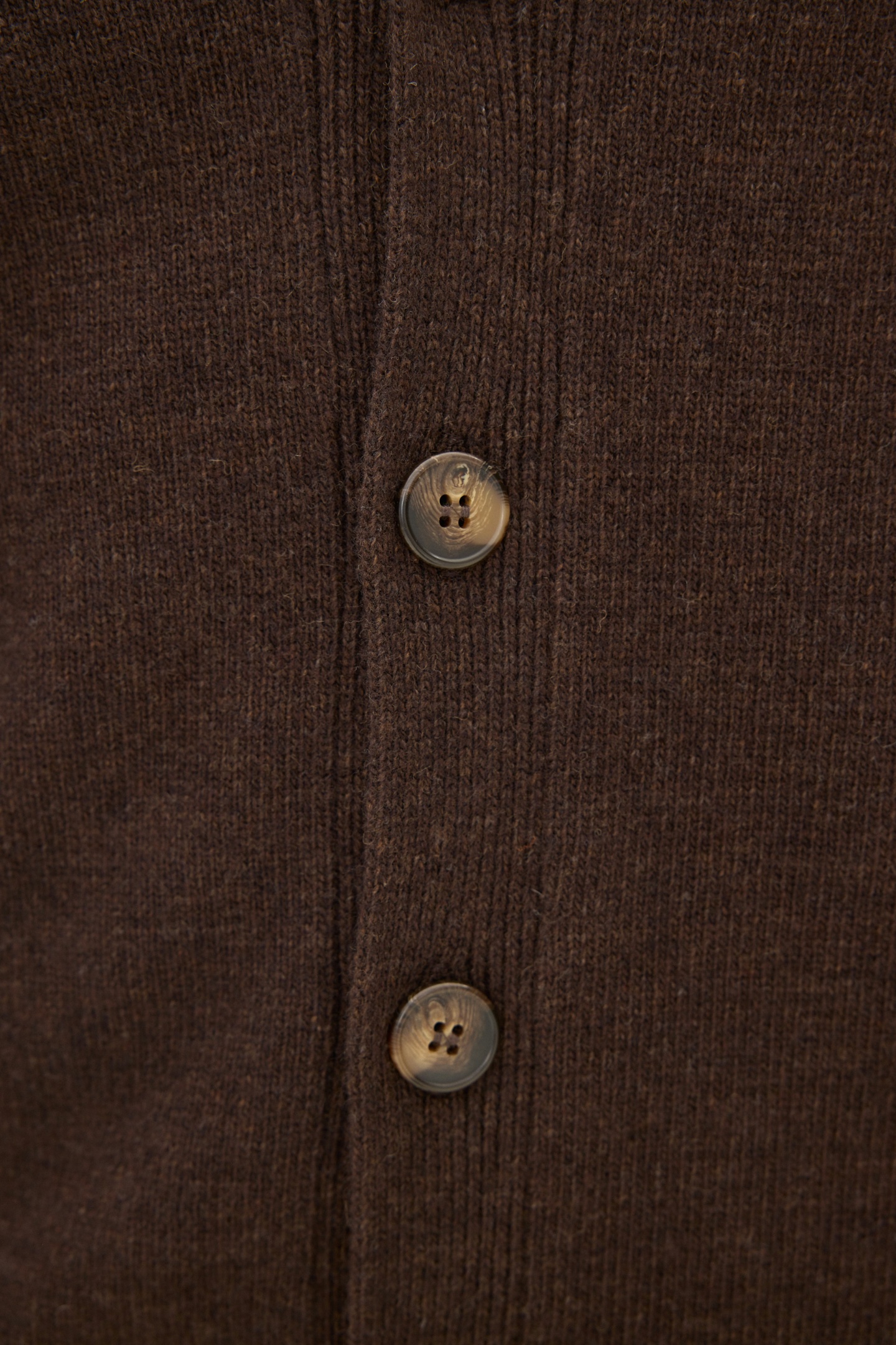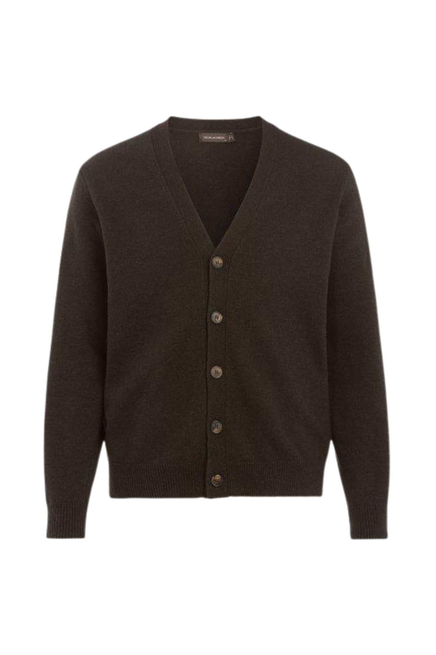Classic cardigan style with brown buttons down the front. Traditional 1x1 ribbing at the cuffs and hem. Regular fit, making it perfect for wearing over a shirt or T-shirt. Knitted in 7gg in a ... Sjá nánar
