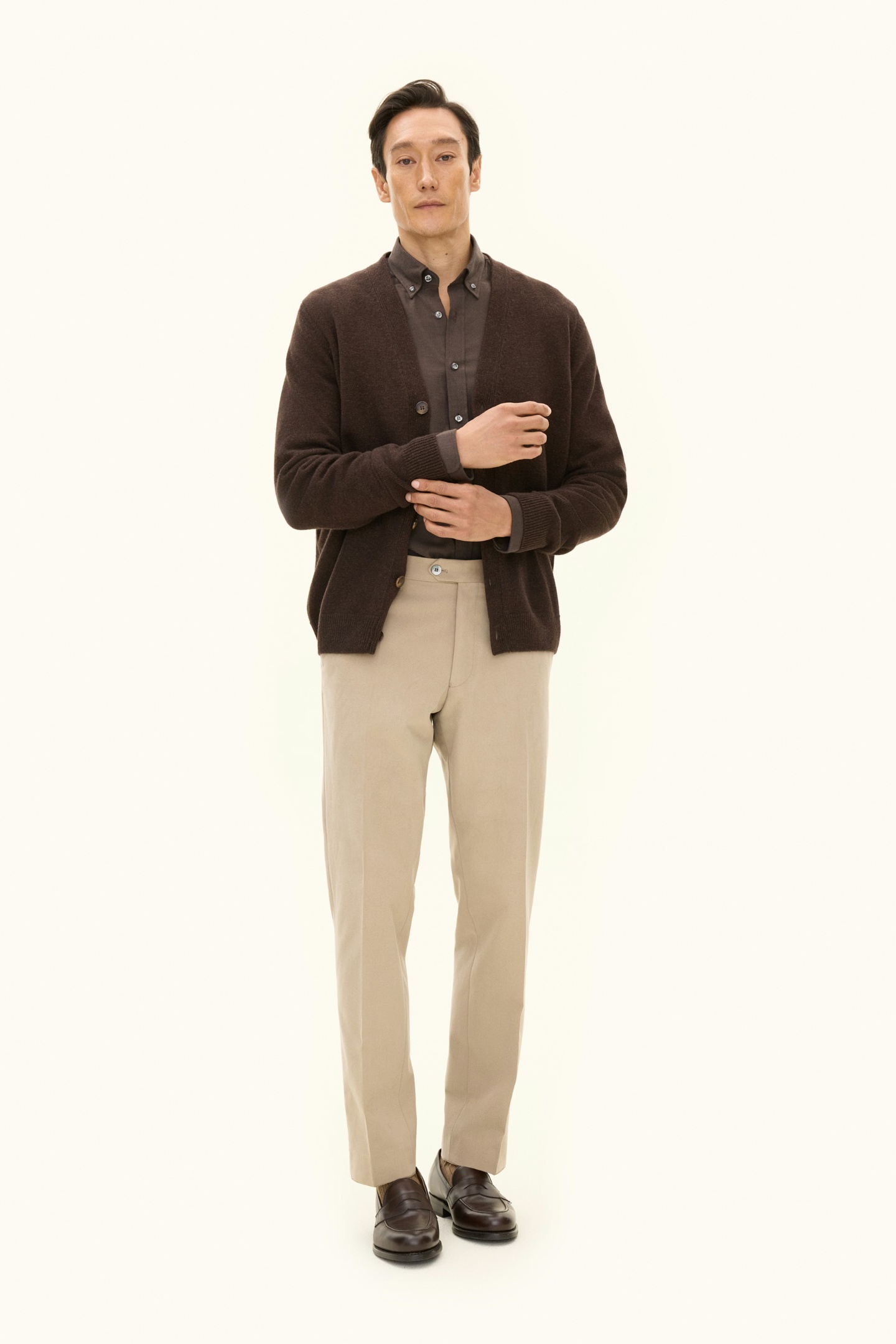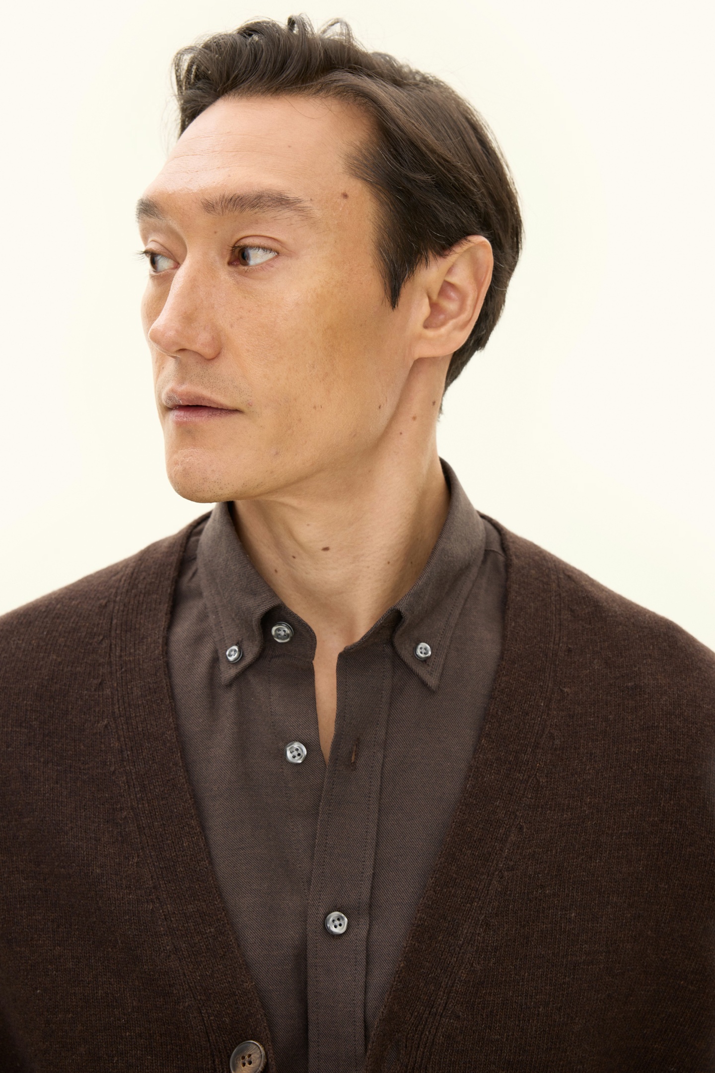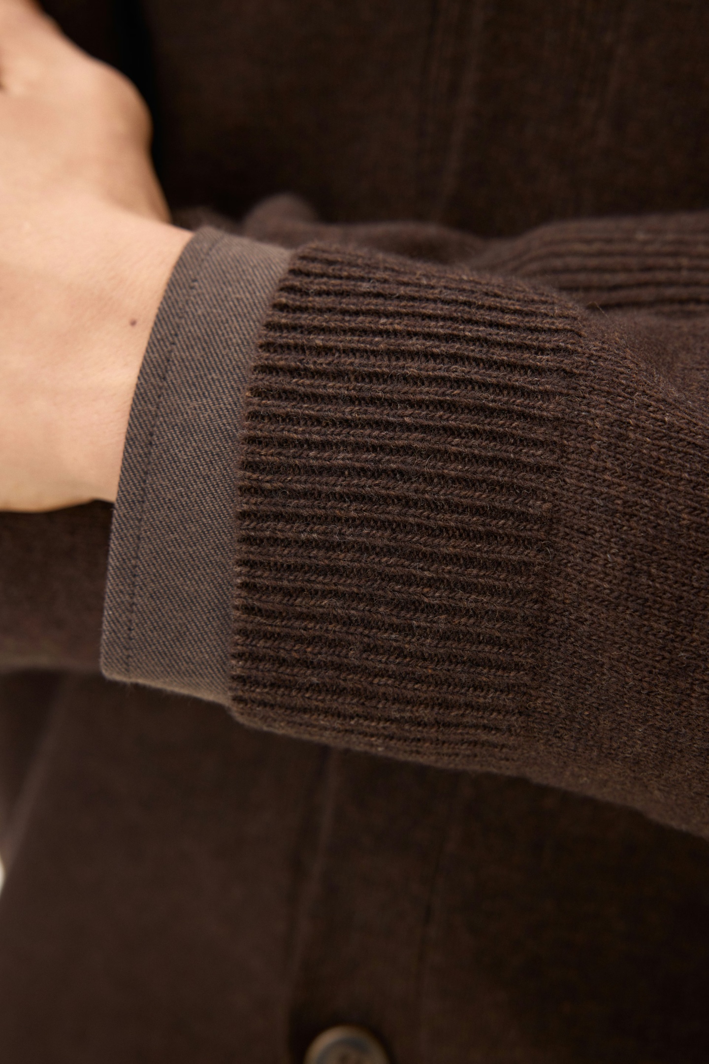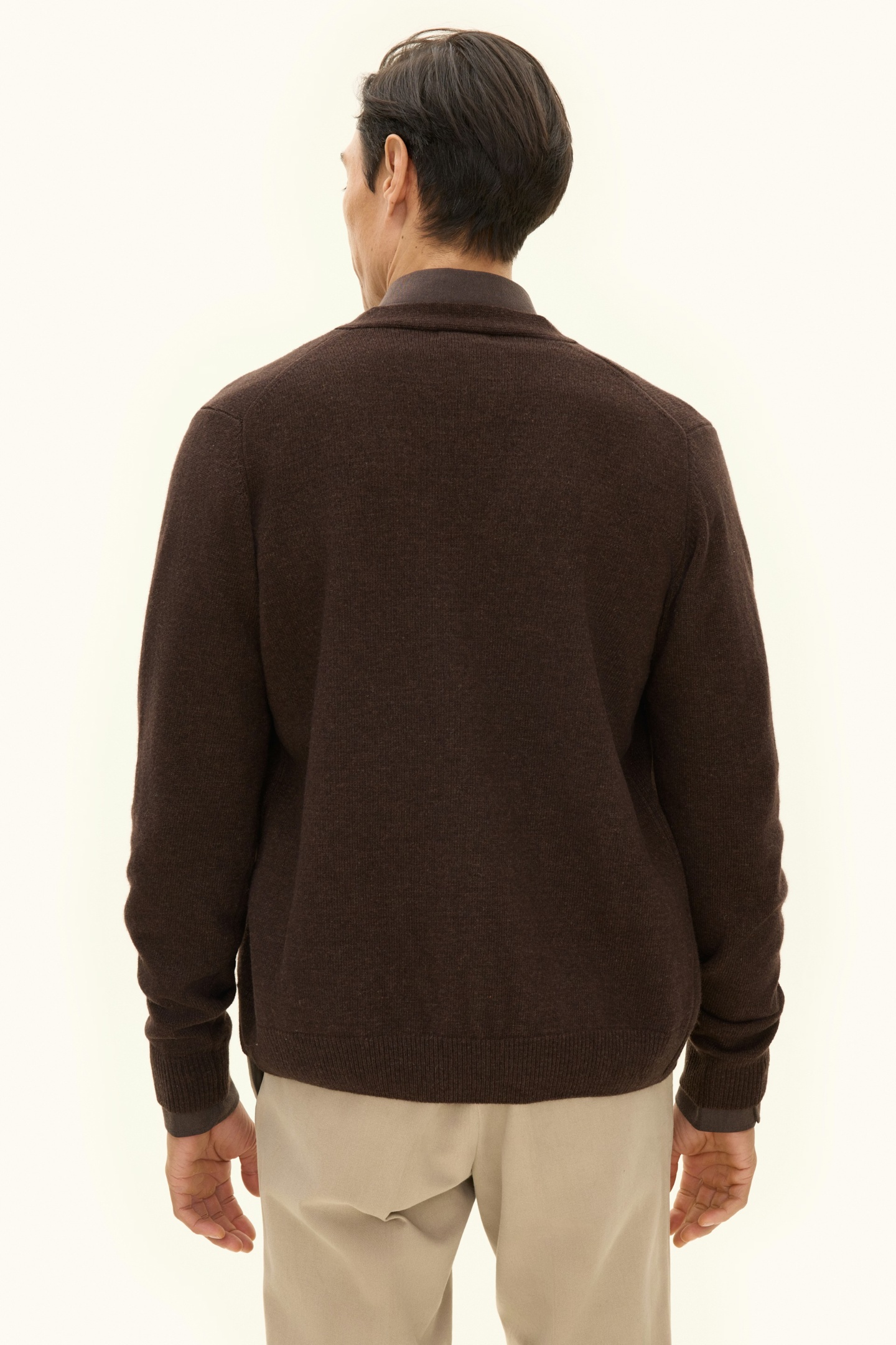 Classic cardigan style with brown buttons down the front. Traditional 1x1 ribbing at the cuffs and hem. Regular fit, making it perfect for wearing over a shirt or T-shirt. Knitted in 7gg in a ... Sjá nánar