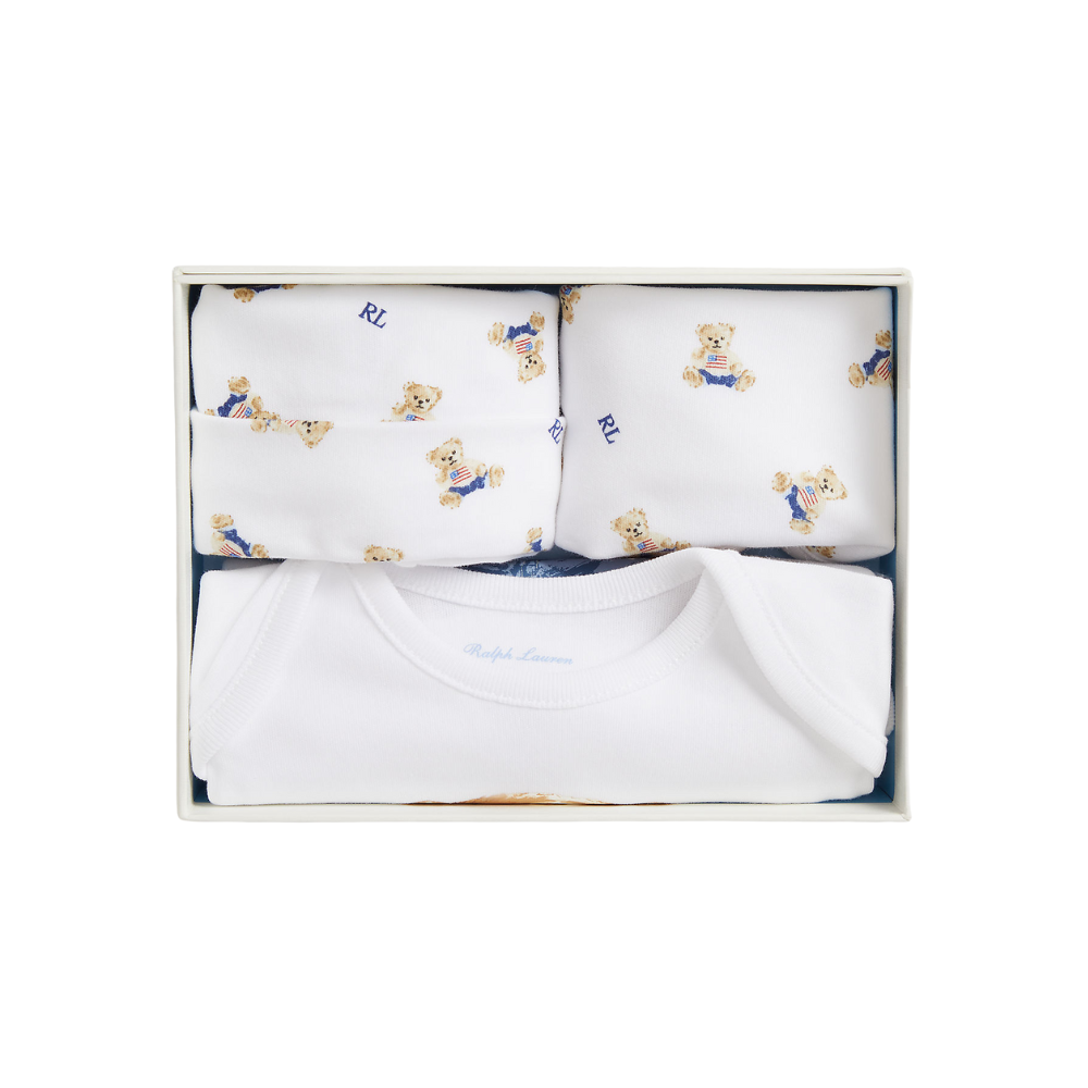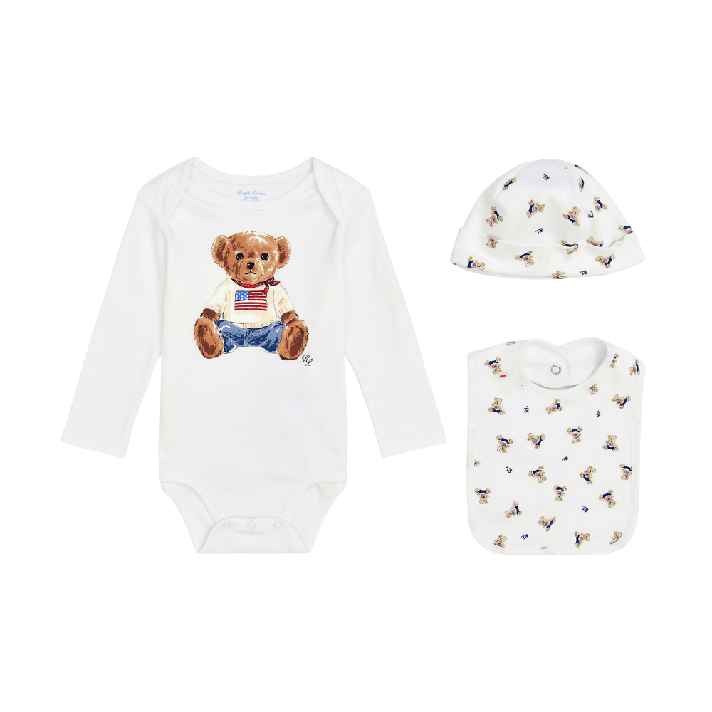 Fallegt gjafasett frá Polo Ralph Lauren. Settið kemur í fallegum kassa og inniheldur samfellu, húfu og smekk. 100% bómull.