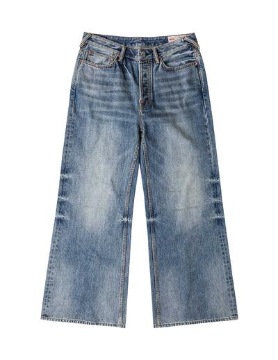 Töff gallabuxur frá Evisu í retro víðu sniði, með prentuðu mynstri á rassvasanum sem einkennir Evisu merkið.