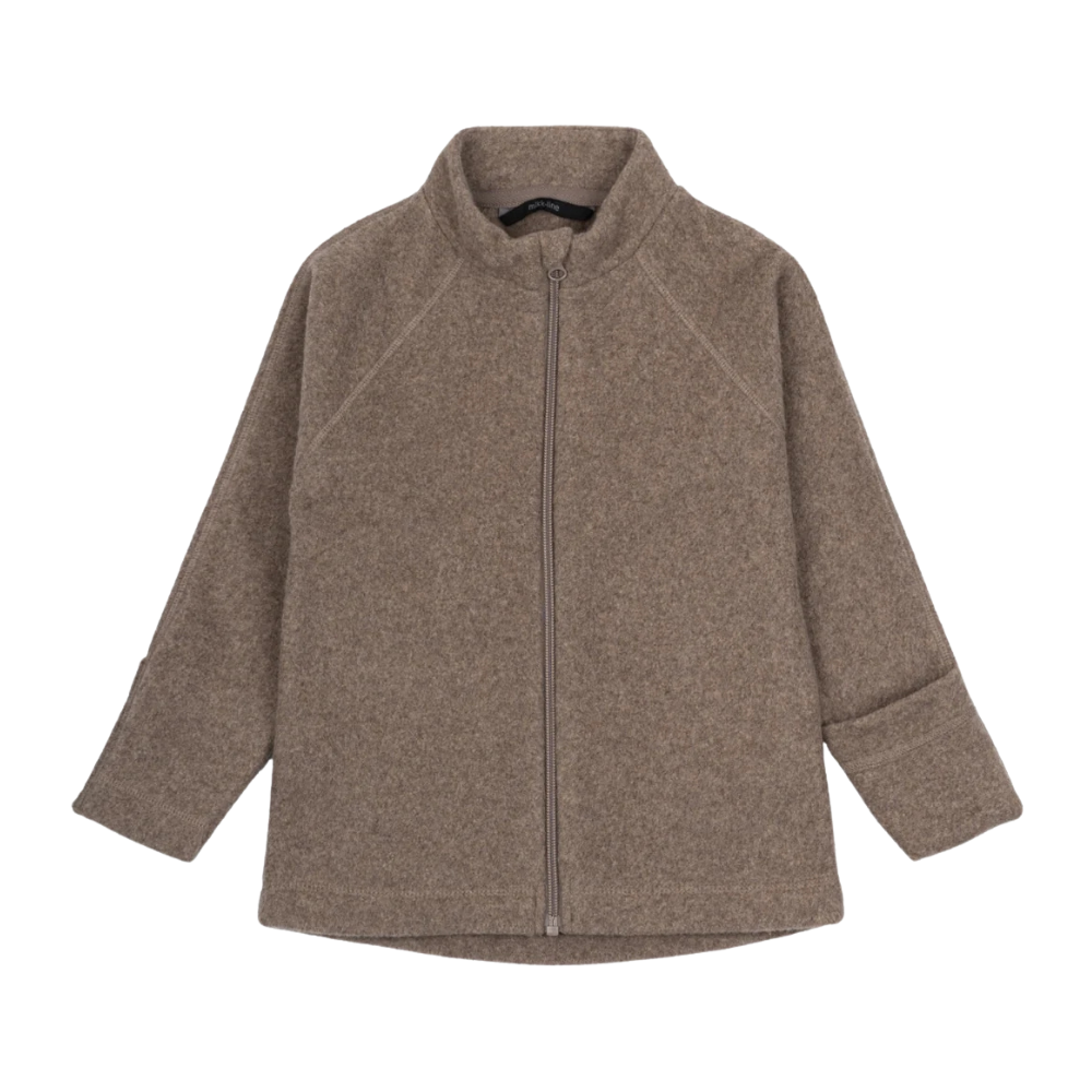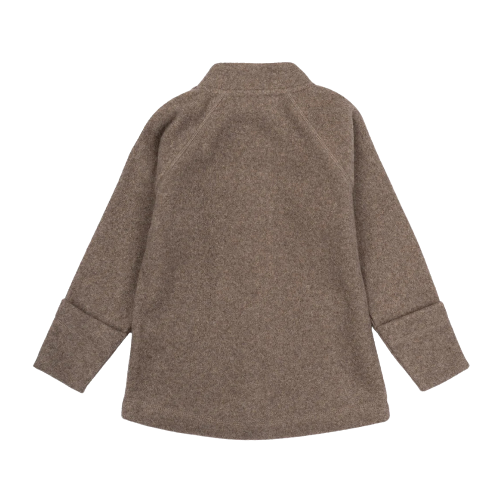 Falleg, brún flíspeysa frá Mikk-line sem andar vel og heldur góðum hita. Peysan er rennd að framan með brettanlegri ermi sem hægt er að toga niður fyrir fingur. 85% bómull og 15% polyester.