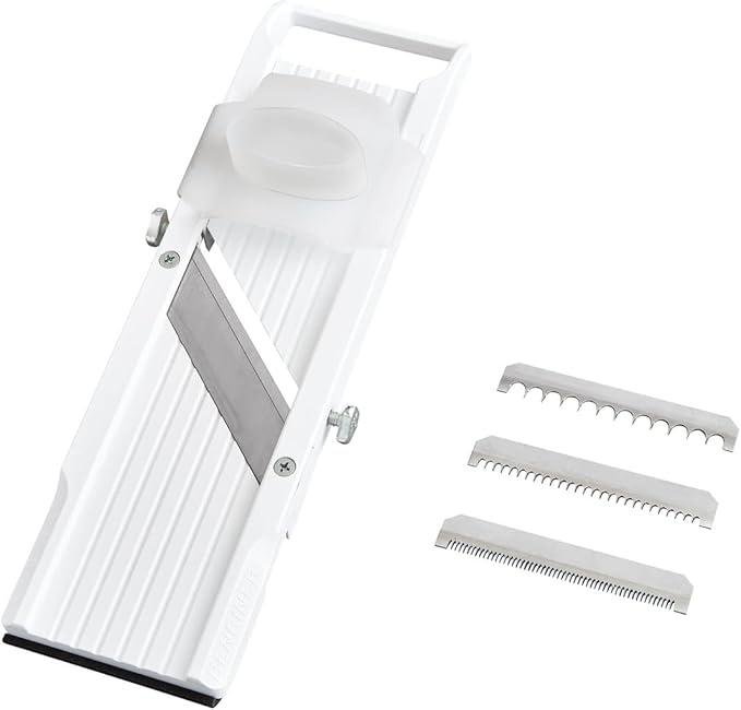 Mandólín m.3 blöðum Mandólín m.3 blöðum Hægt er að velja á milli mismunandi þykktir frá 1 mm til 5 mm alltfrá 0,5 mm til 0,8 mm Fullkomið fyrir kartöflur, gúrkur, gulrætur, epli, lauk og ... Sjá nánar