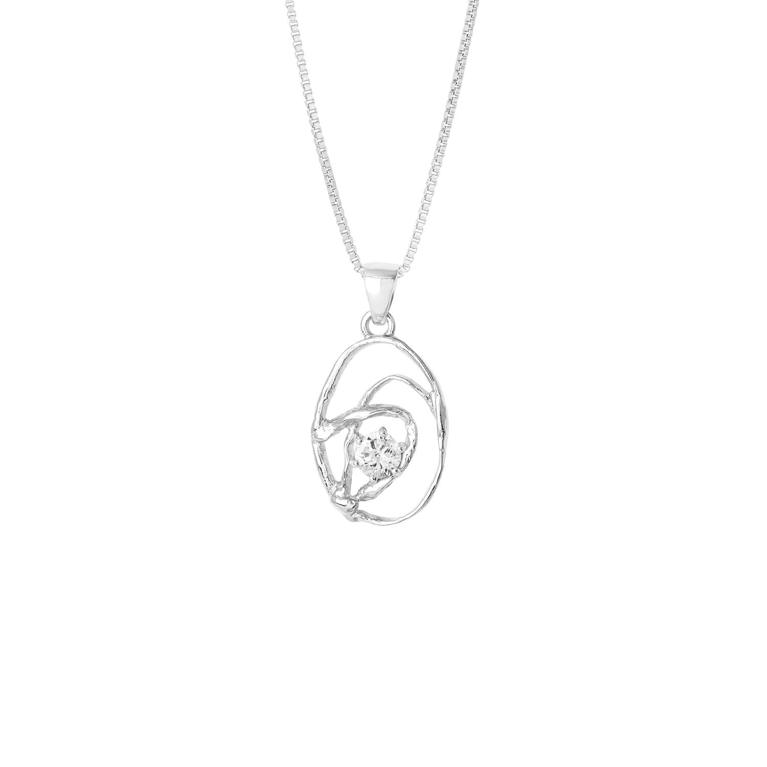 Hálsmenið er handsmíðað úr rhodiumhúðuðu silfri með cubic zirconia steini. Hæð mensins er um 20 mm. Hönnuður og smiður er Berglind Snorra.