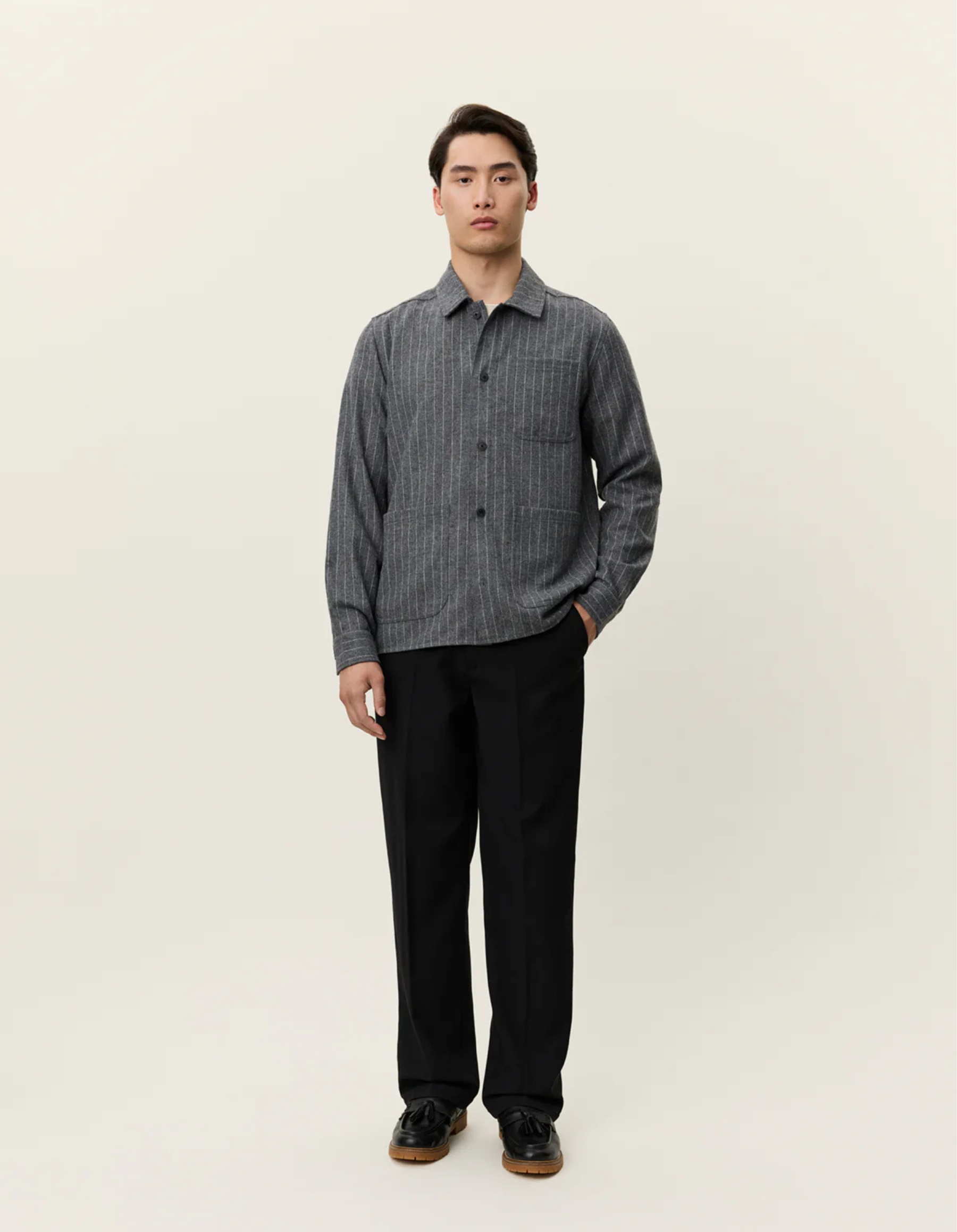 A refined take on workwear layering. The Layton Overshirt is cut from a mouliné wool blend, woven with a subtle pinstripe for a structured yet versatile look. Designed with button closure, ... Sjá nánar