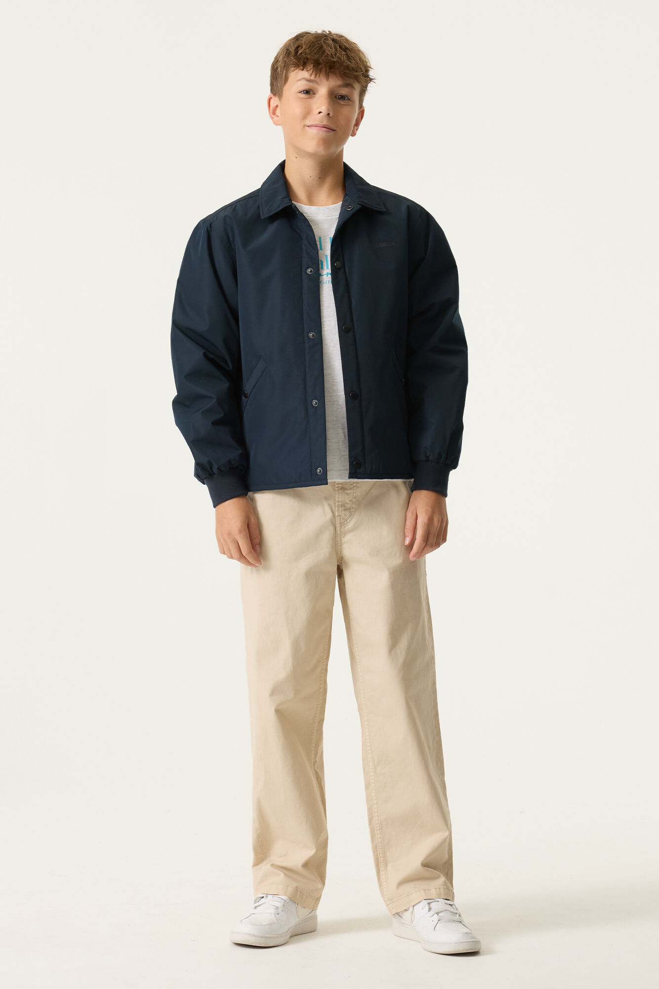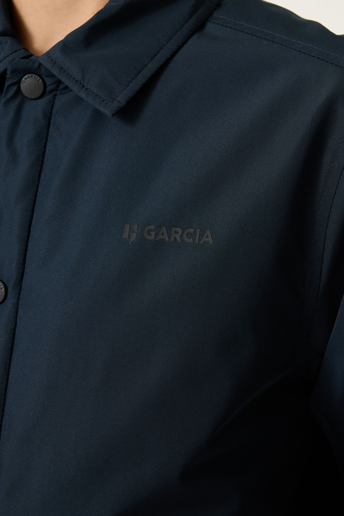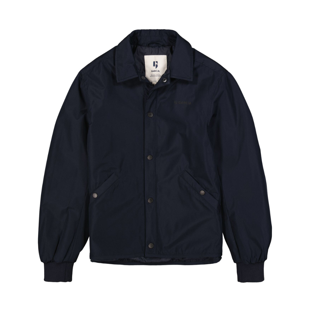 Dökk blár, renndur jakki frá Garcia. 100% polyester.