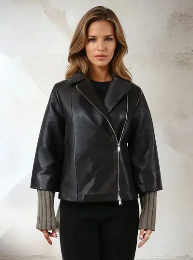 Töff dökkbrúnn leðurjakki frá Levinsky með ullarermum sem hægt er að fjarlægja.