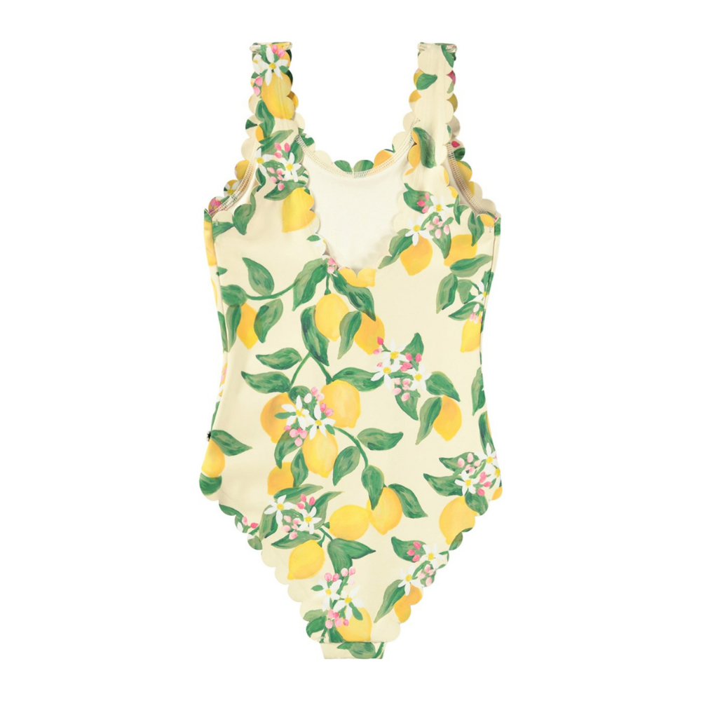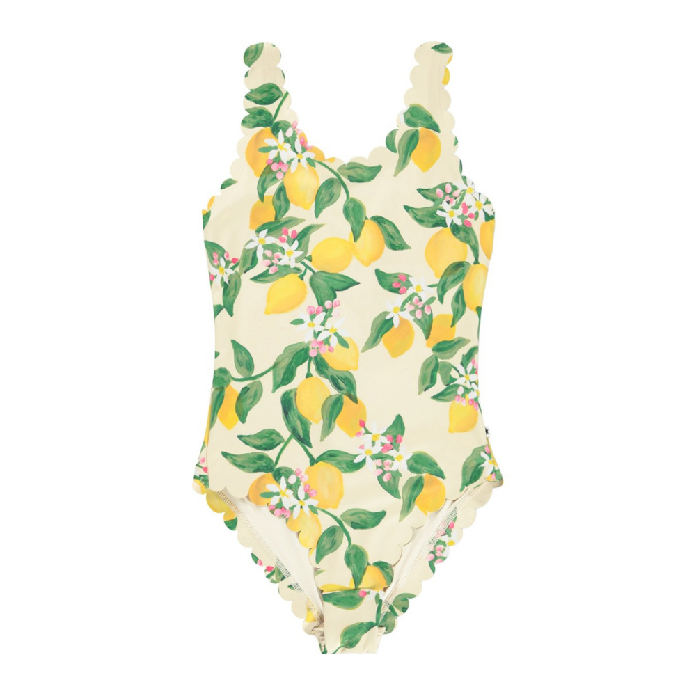 Mynstraður sundbolur frá Molo með opnu baki. 80% polyester og 20% elatane.